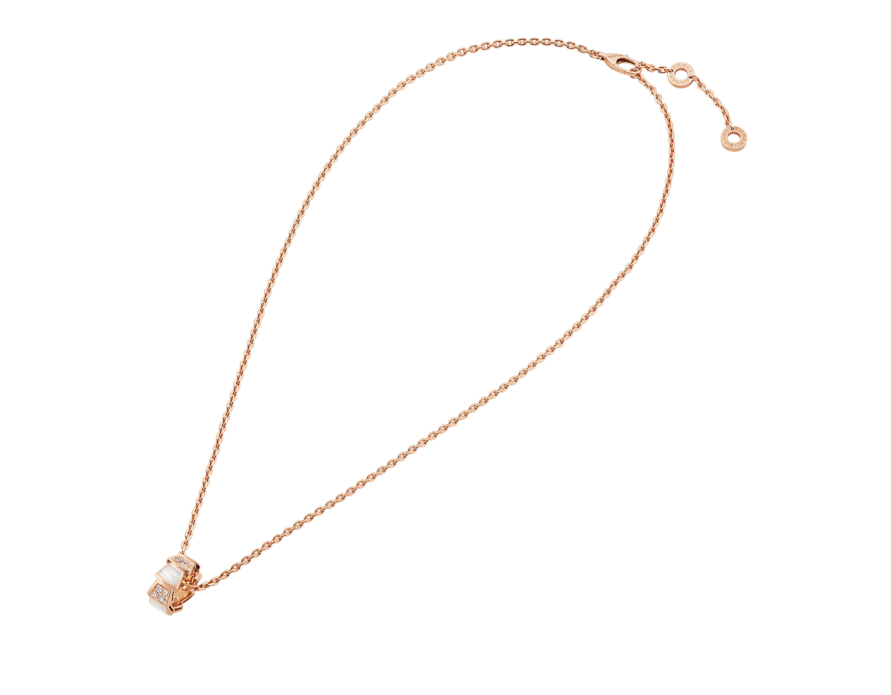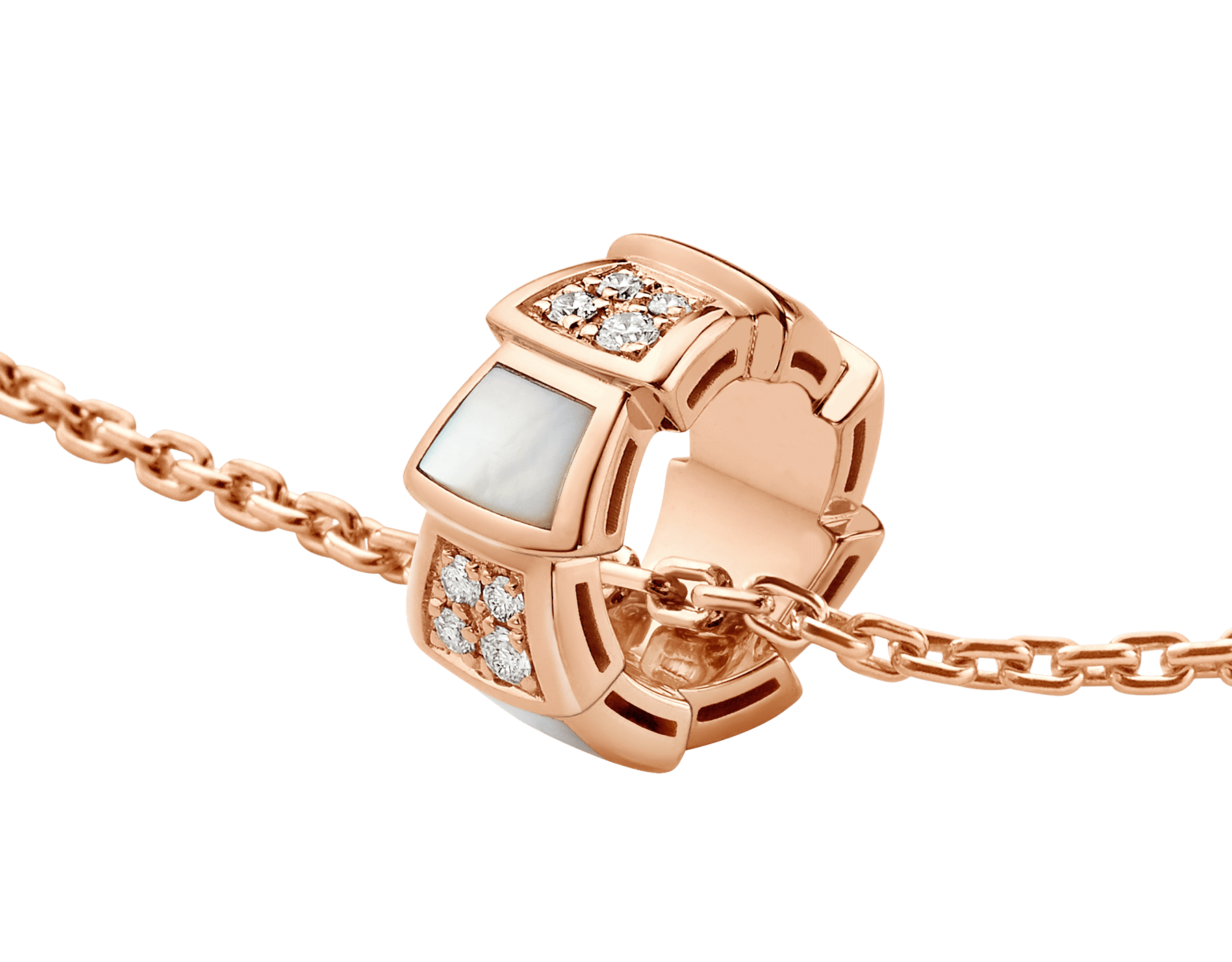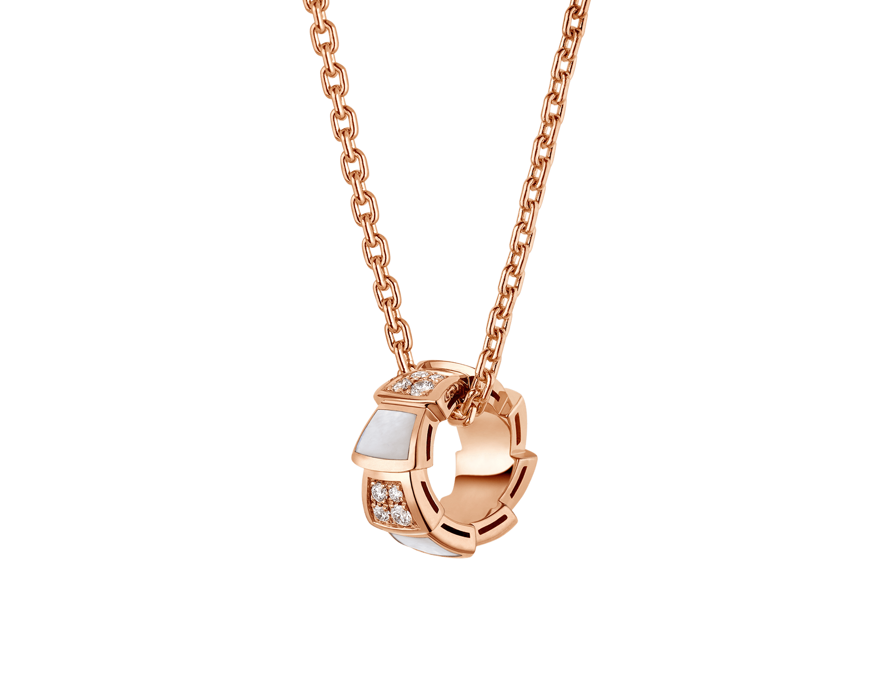 攻撃を仕掛ける前のヘビの渦を巻くような動きを思わせるペンダント。うろこの危険な美しさとしなやかなヘビの動きを融合し、センシュアルにチェーンに巻き付きます。光と影、知恵と欲望、誘惑と欲望が魅惑的に交差。心を奪うようなデザインが、ヘビの抗しがたい二面の本質を露わにしています。 セルペンティ ヴァイパー ネックレス。マザー・オブ・パールのインサートとパヴェダイヤモンドをあしらった18Kピンクゴールド製。