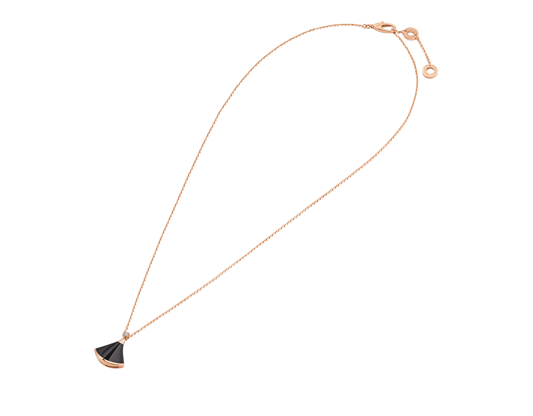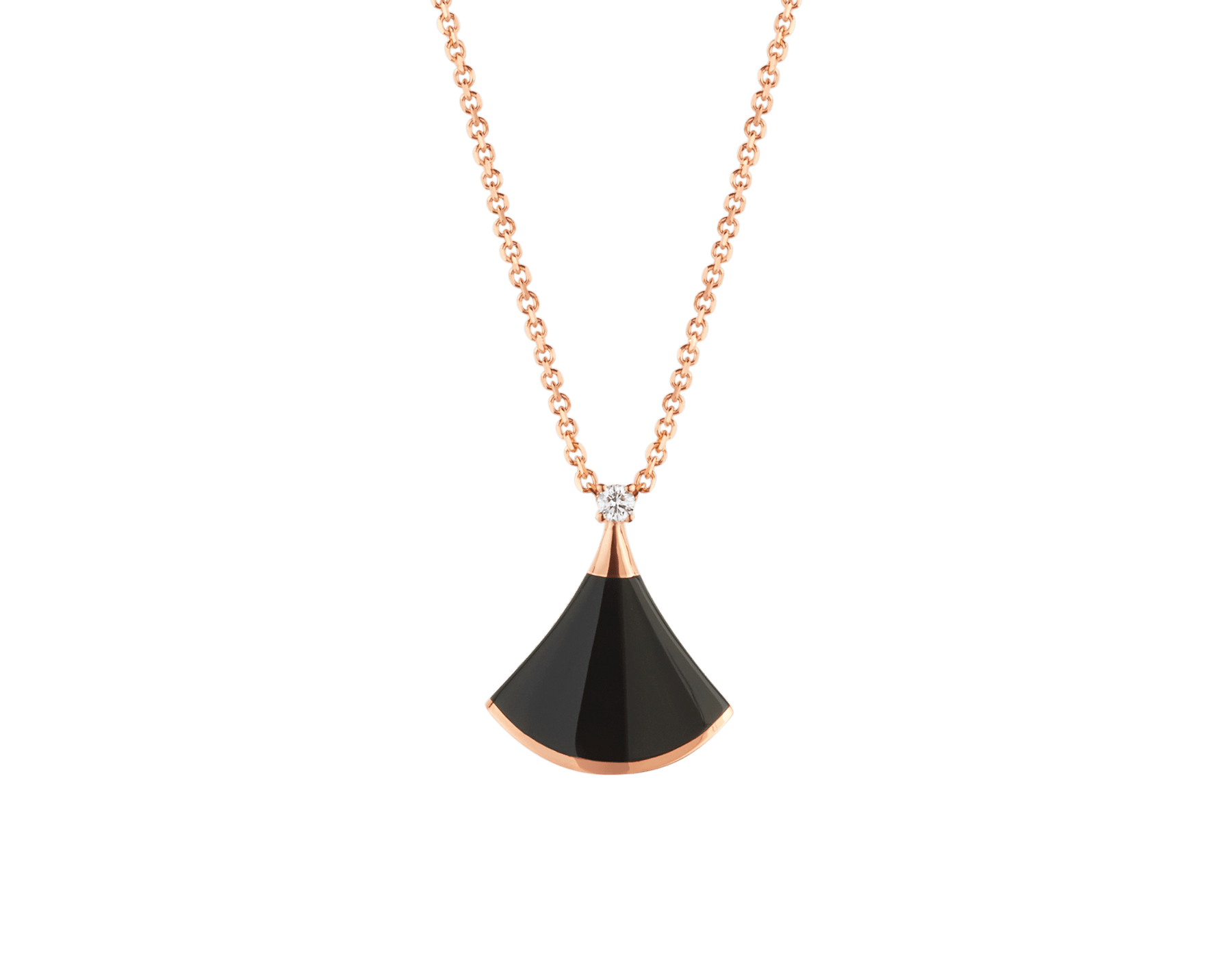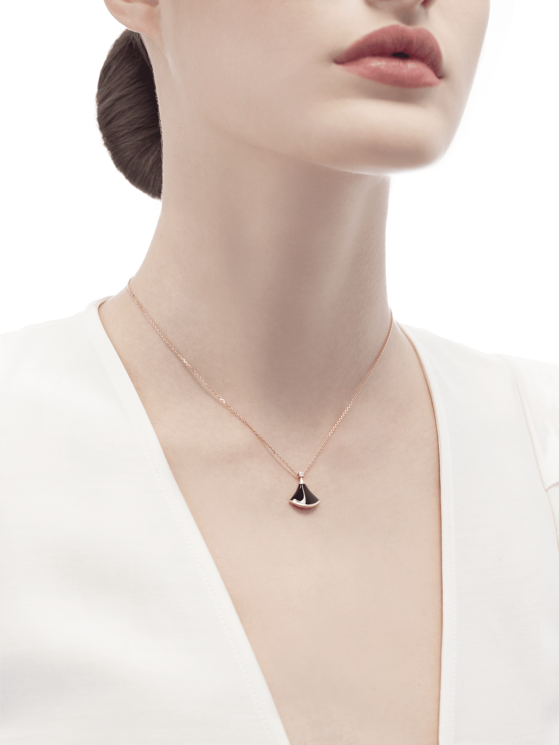 フェミニンなエレガンスと永遠の都の魅力からインスピレーションを得たディーヴァ ドリーム ネックレス。紛れもないローマのスピリットを持つ魅惑的なディーヴァたちにオマージュを捧げています。まさにフェミニンで洗練されたネックレス。カラカラ浴場の大理石の壮麗さと、その扇型のモザイクのセンシュアルな曲線を捉えて作られました。イタリアン・ビューティーの真髄を表現しています。 オニキスとダイヤモンドを使用した18Kピンクゴールド製ディーヴァ ドリーム ネックレス。ペンダントトップは、縦横ともに1.5cm。チェーンの長さは41-43 cm。