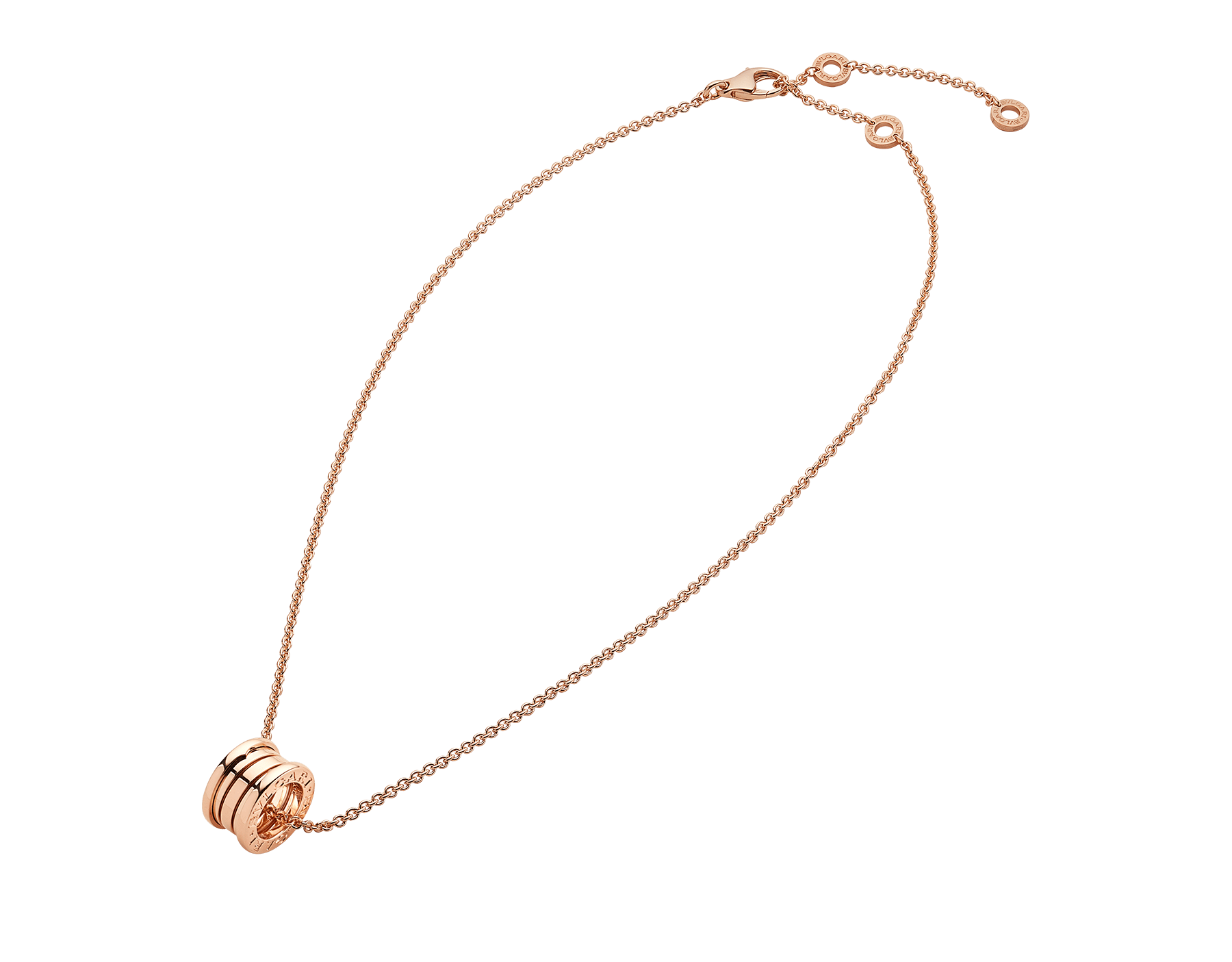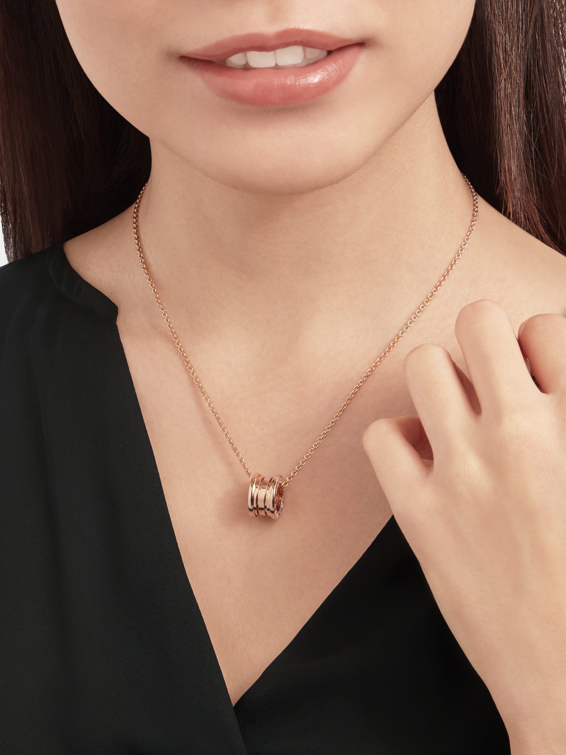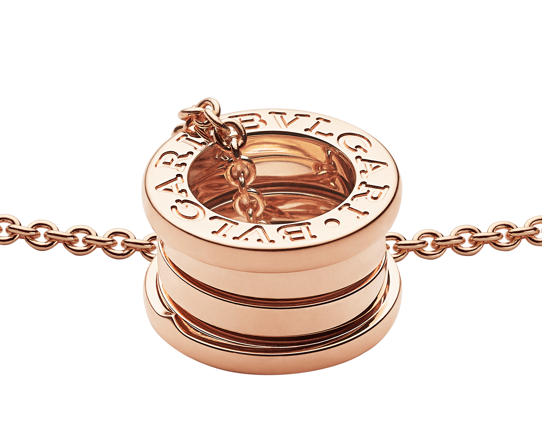 世界でもっとも有名な円形競技場コロッセオからインスピレーションを得たビー・ゼロワン ネックレス。創造的なブルガリの世界観を真に表現し、ジュエリーデザインの真髄に迫ります。その特徴的な螺旋(らせん)に宿る純粋さは、「永遠の都」ローマの壮大さに映し出された、過去、現在、そして未来の調和を表すシンボルであり、コレクションの先駆的な精神の象徴でもあります。 18Kピンクゴールド製ビー・ゼロワン スモールラウンドペンダント。ペンダントトップは直径1.52cm。チェーンの長さは38-45cm。