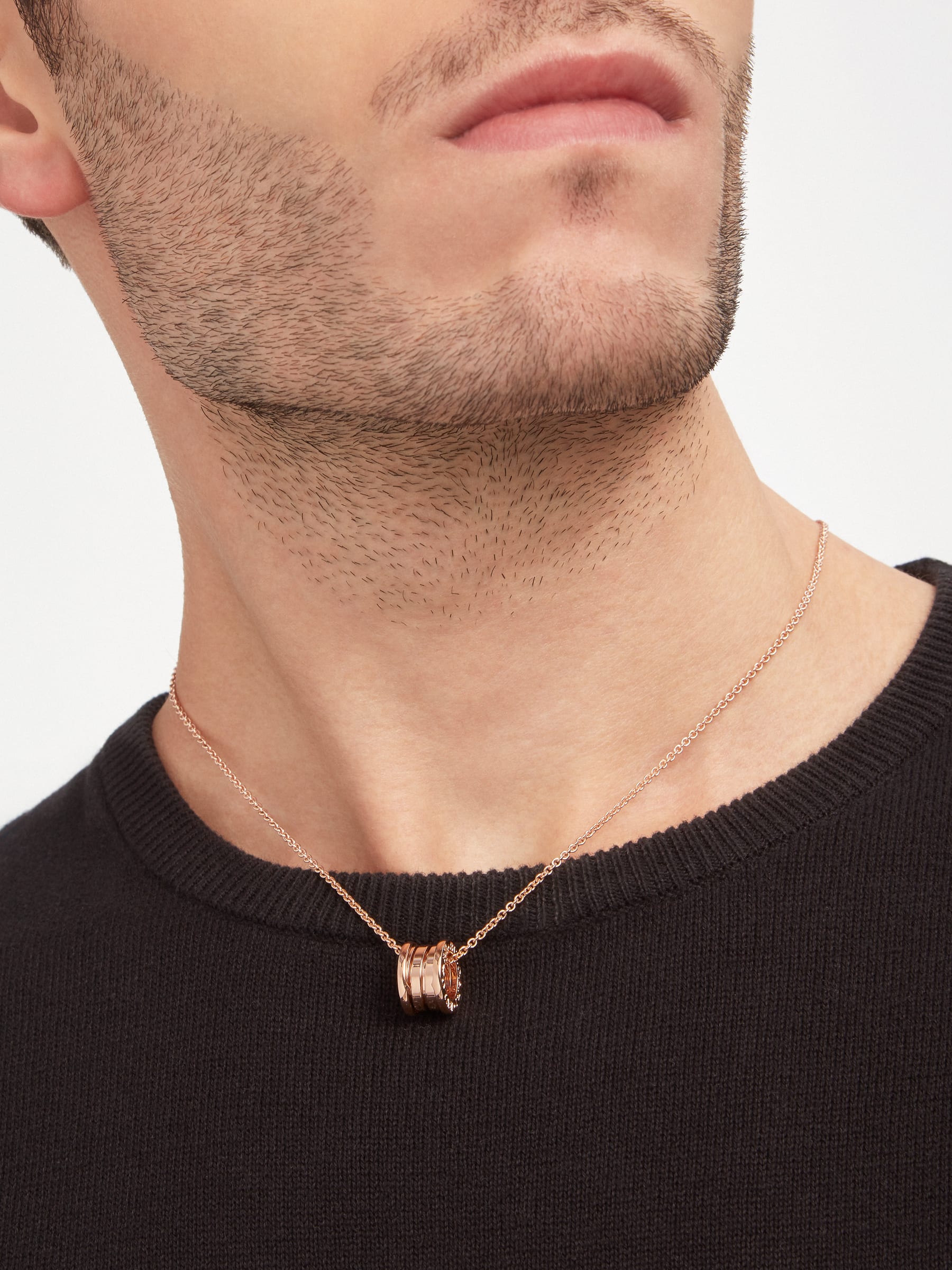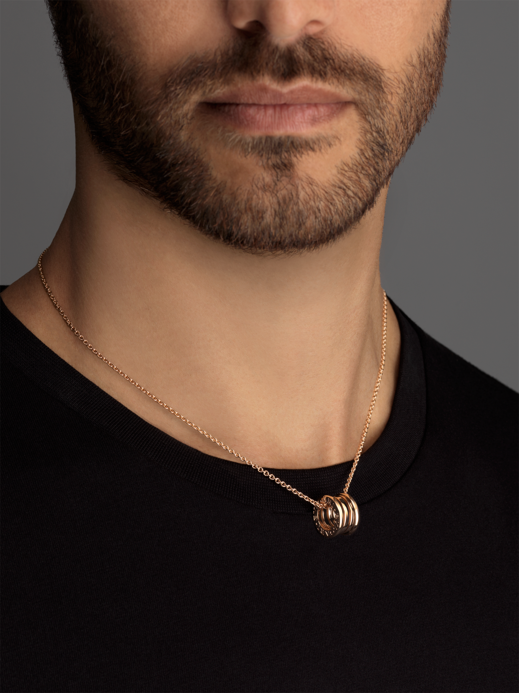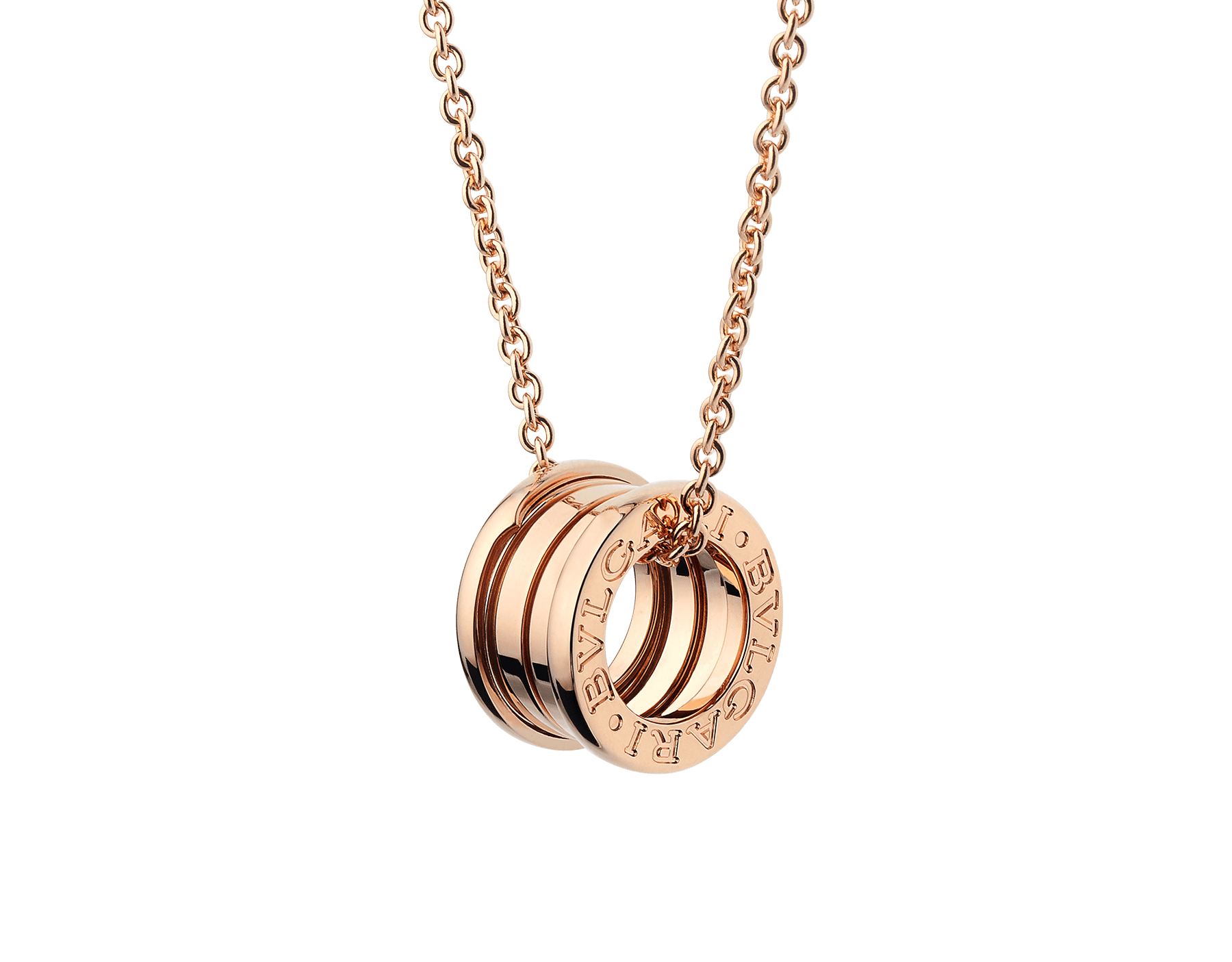 世界でもっとも有名な円形競技場コロッセオからインスピレーションを得たビー・ゼロワン ネックレス。創造的なブルガリの世界観を真に表現し、ジュエリーデザインの真髄に迫ります。その特徴的な螺旋(らせん)に宿る純粋さは、「永遠の都」ローマの壮大さに映し出された、過去、現在、そして未来の調和を表すシンボルであり、コレクションの先駆的な精神の象徴でもあります。 18Kピンクゴールド製ビー・ゼロワン スモールラウンドペンダント。ペンダントトップは直径1.52cm。チェーンの長さは38-45cm。
