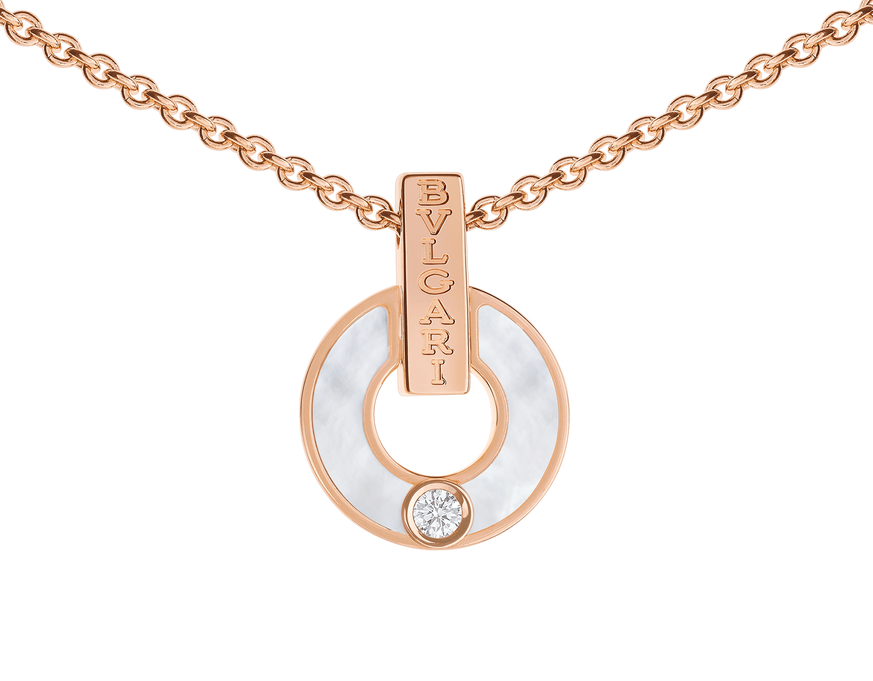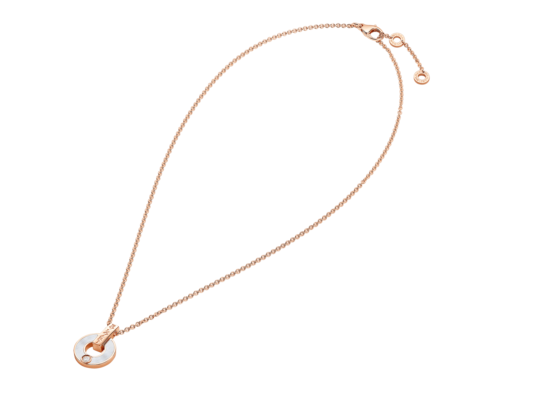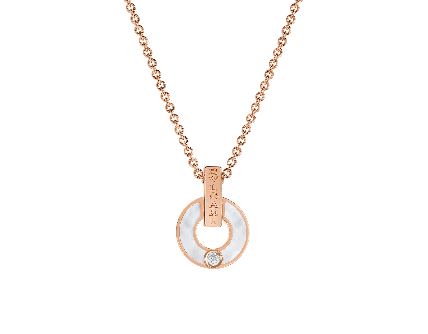 ブルガリ・ブルガリ オープンワーク ネックレス。マザー・オブ・パールのインサートとブリリアントカット・ダイヤモンドをあしらった18Kピンクゴールド製。
