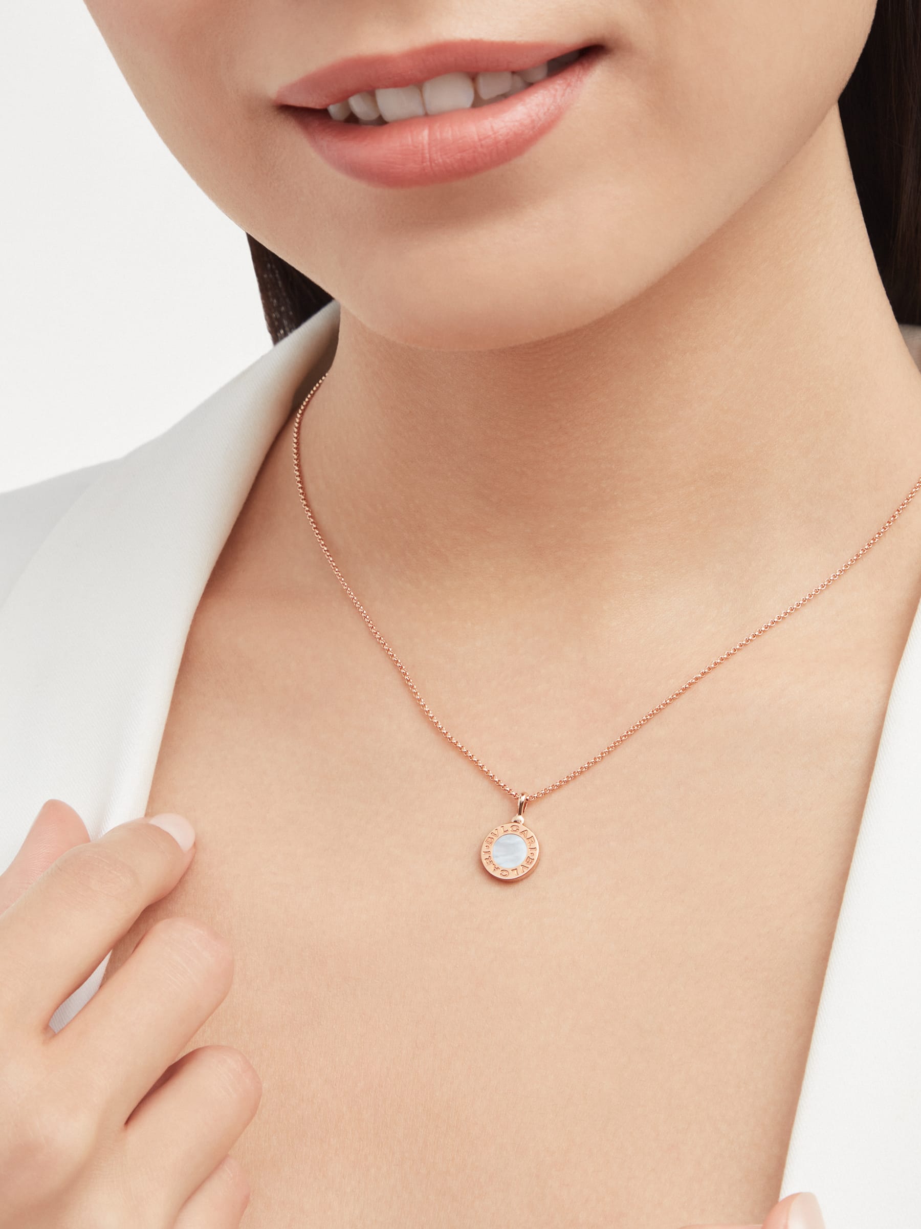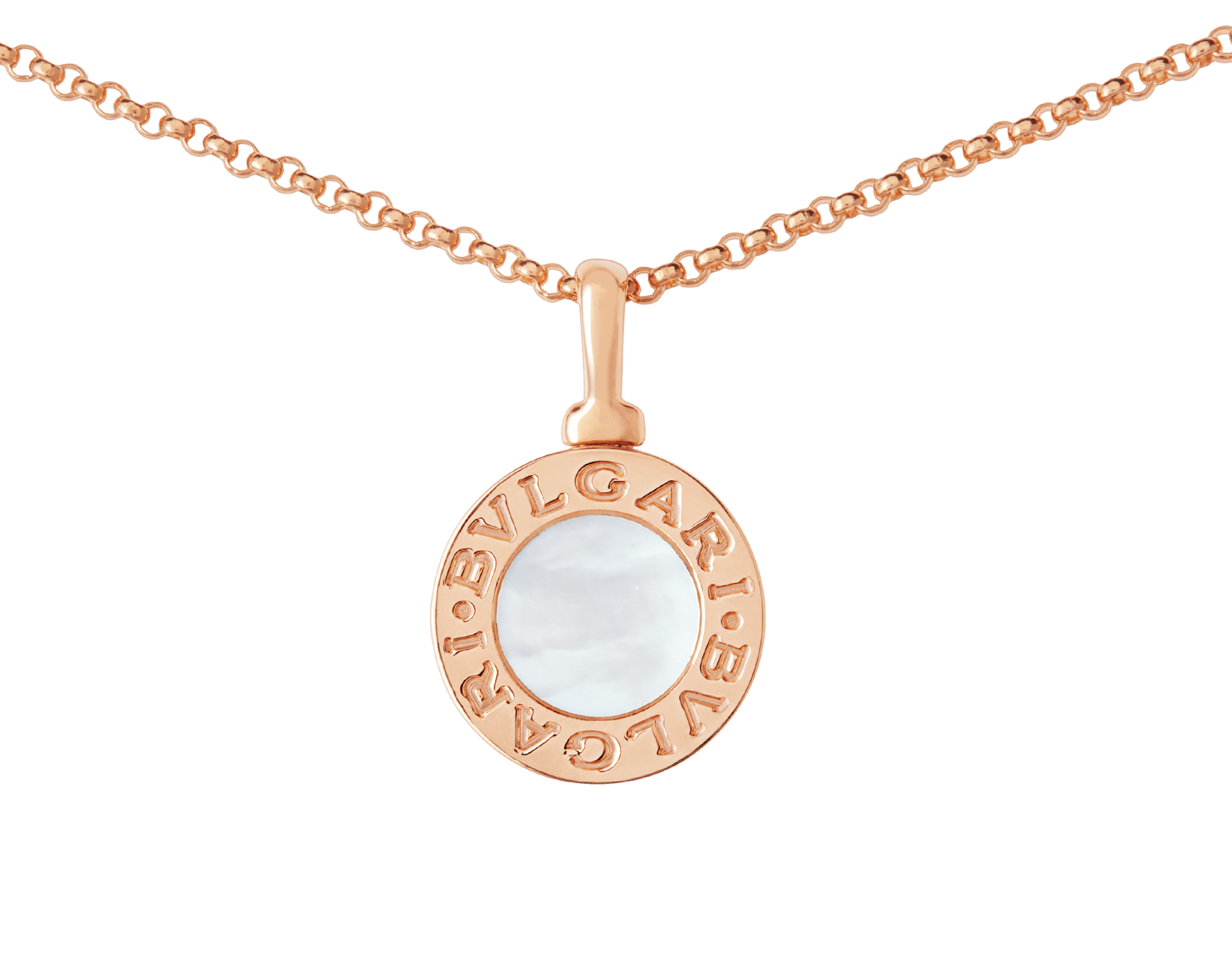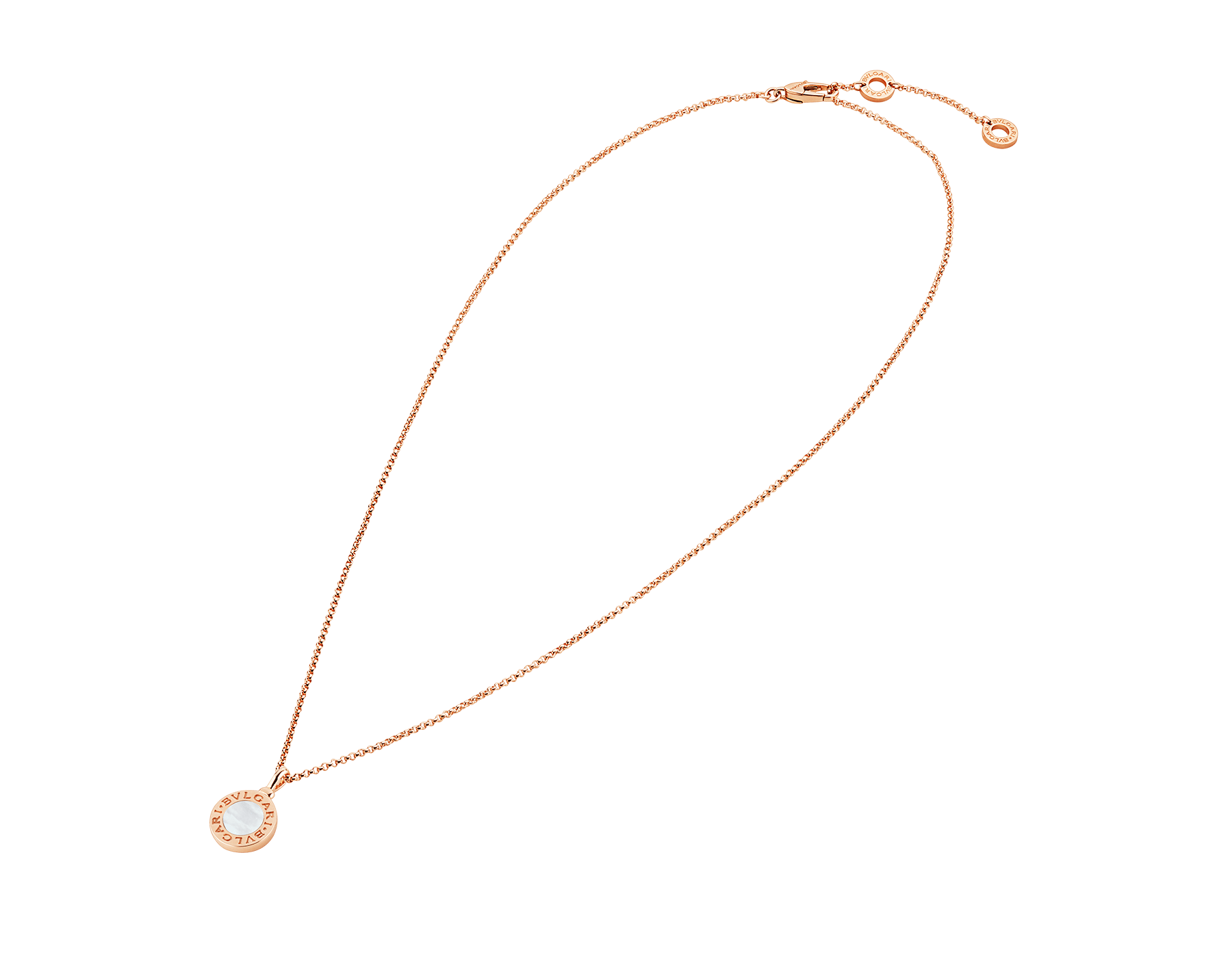 ローマをルーツとしたブランドは、歴史的文化とモダニティを雅びやかに融合するブランドに成長。ブルガリ・ブルガリのネックレスは、快活でコンテンポラリーな気品を主張します。トレードマークのダブルロゴは、古代のコインに施された曲線的な文字からインスピレーションを得て誕生しました。今日このロゴは遊び心のある意外な進化を遂げ、特徴的なデザインエレメントを構成しています。 ブルガリ・ブルガリ ペンダント ネックレス。マザー・オブ・パールをあしらった18Kピンクゴールド製。長さ16-17 (41-43 cm) 。