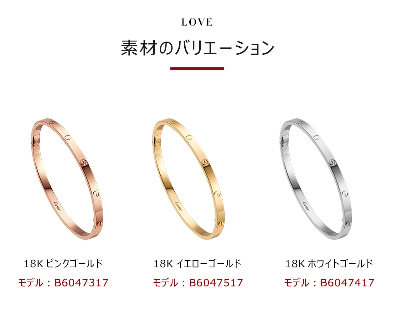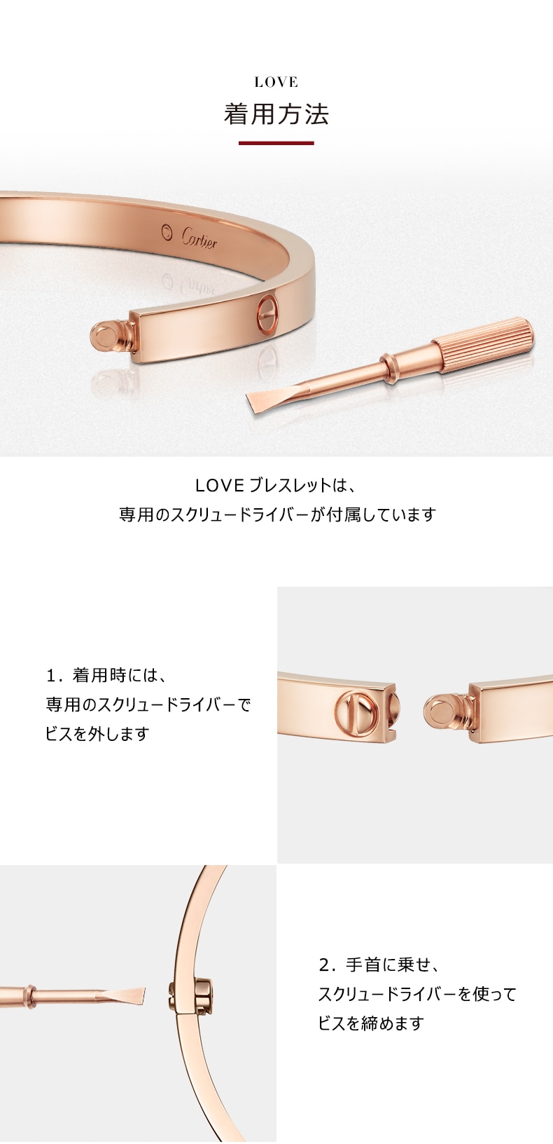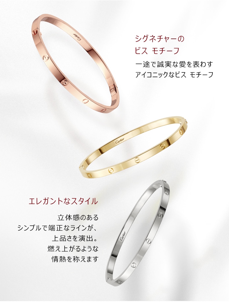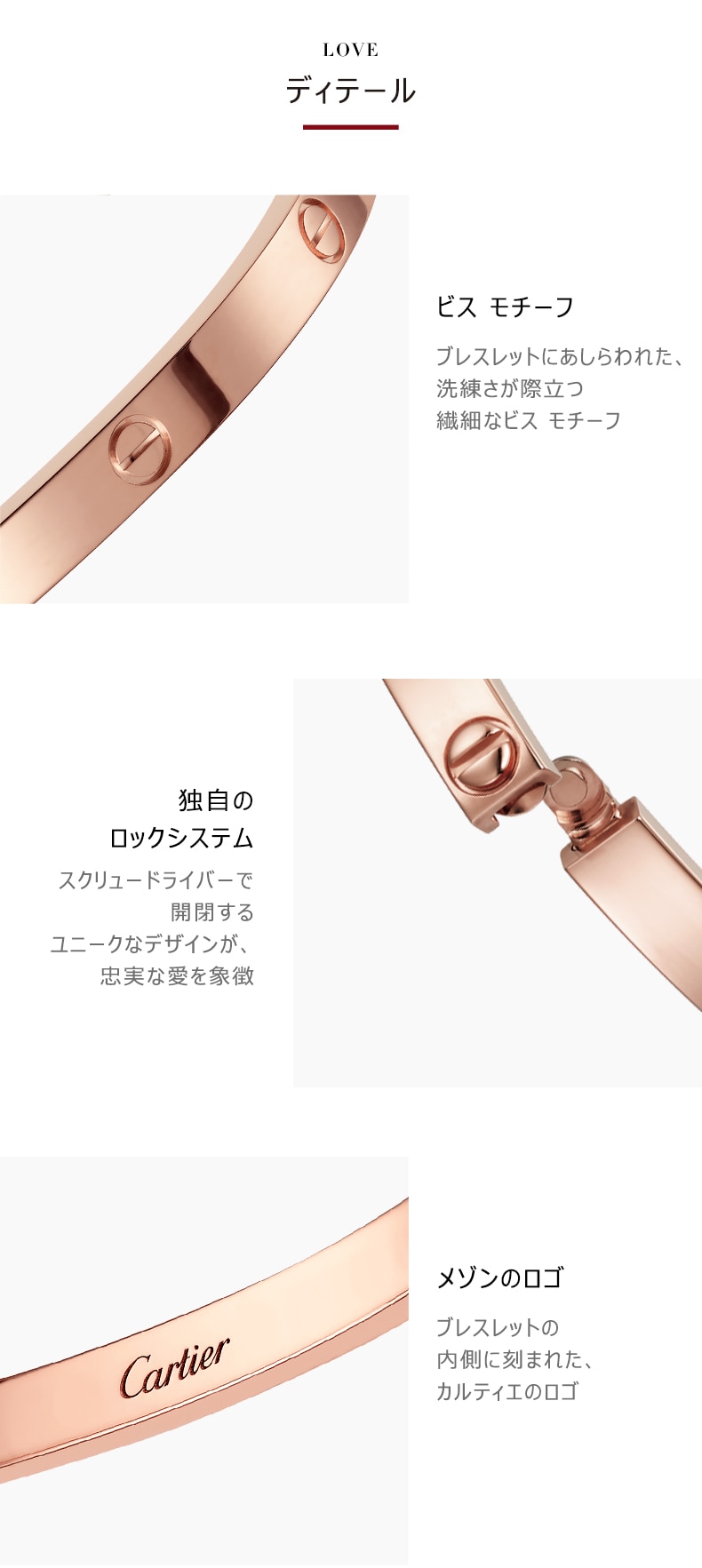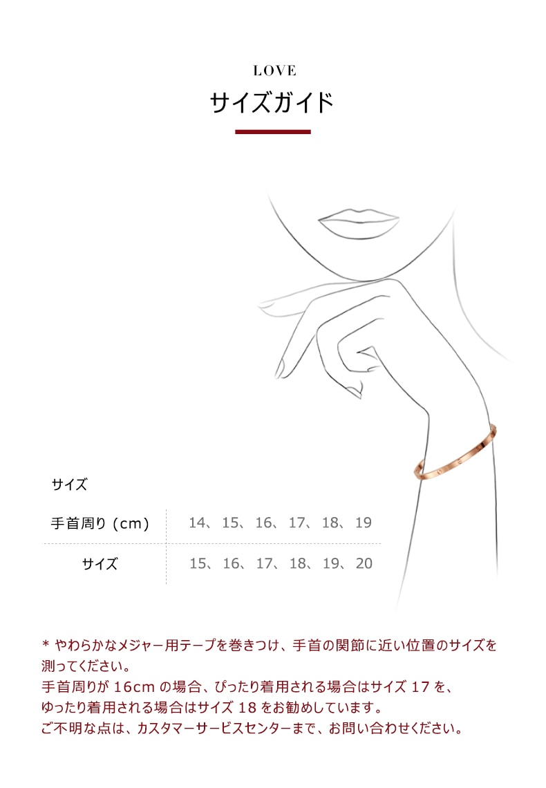 Love ブレスレット、ホワイトゴールド750/1000、ブリリアントカット ダイヤモンド4個(計0.42ct)。スクリュードライバー付き。幅:6.1mm。アイコニックなLove ブレスレットは、1969年の発表以降、自由な Love のシンボルであり続けています。ビスモチーフと有名なロックシステムがタイムレスなデザインを象徴する一方、オーバルなフォルムは手首にしっかりと、しかしながら心地よくフィットします。ロックシステムの要となっているのは、ブレスレットの両側にある2つの機能的なビスです。Love ブレスレットには専用のスクリュードライバーが付属しており、ブレスレットを身に着けるときにはサポートが必要となります。ご自身に合ったLove ブレスレットのサイズは、カルティエのブレスレット サイズ表でご確認ください。ぴったり着用される場合は1cm、ゆったり着用される場合は2cm追加してください。