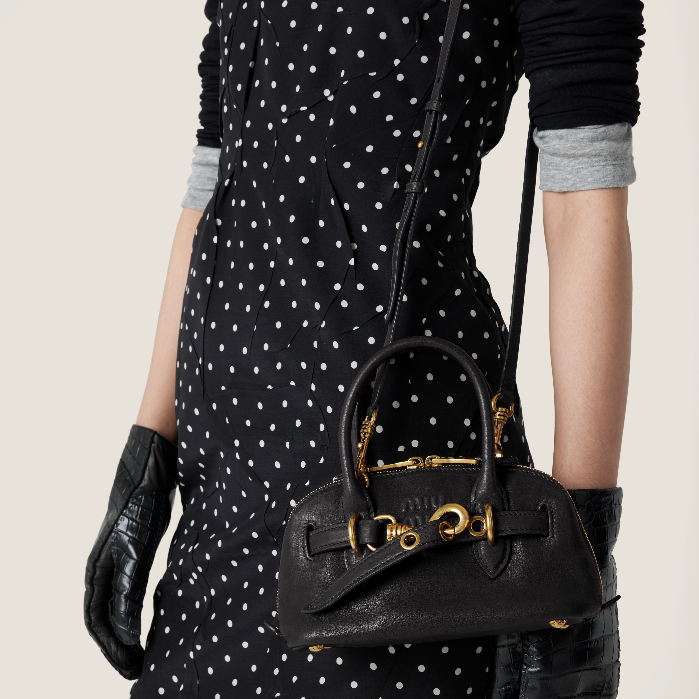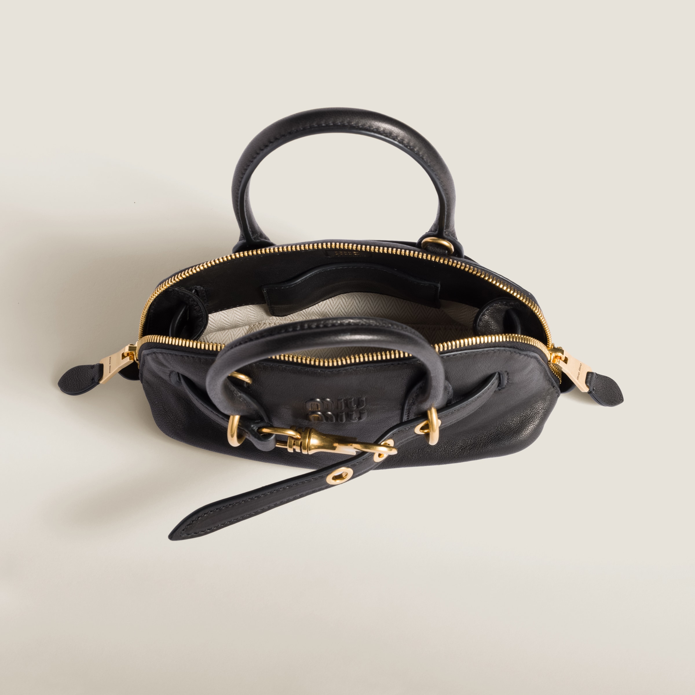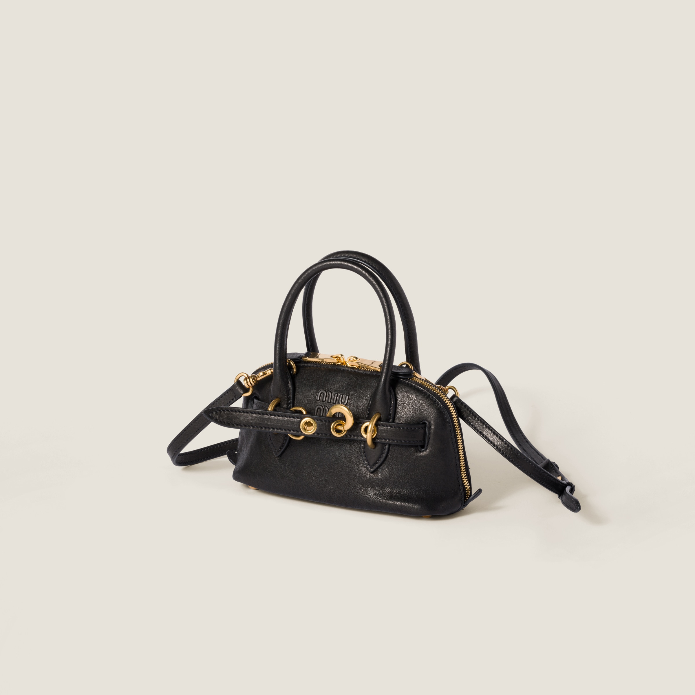 上品でエレガントなシルエットが際立つ、ナッパレザーのアバンチュール ミニバッグ。オリジナリティあふれるフォルムが魅力的なバージョン。エンボス加工のMIU MIU ロゴが、タイムレスなバッグにさりげないアクセントを添えます。