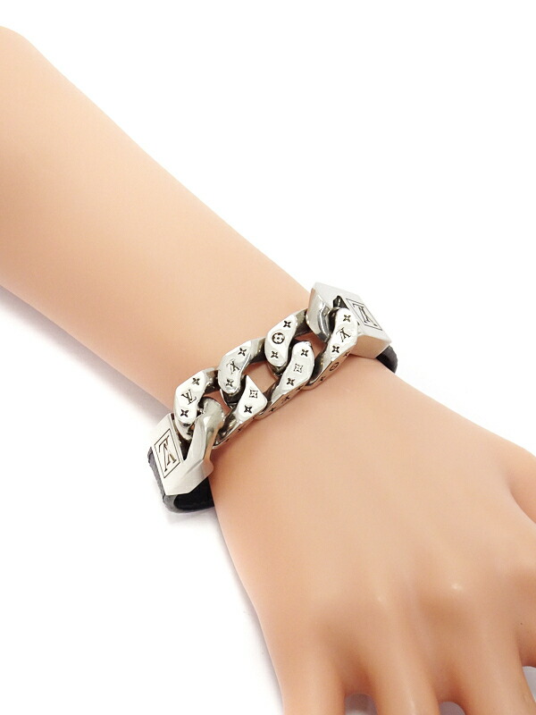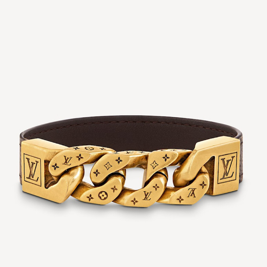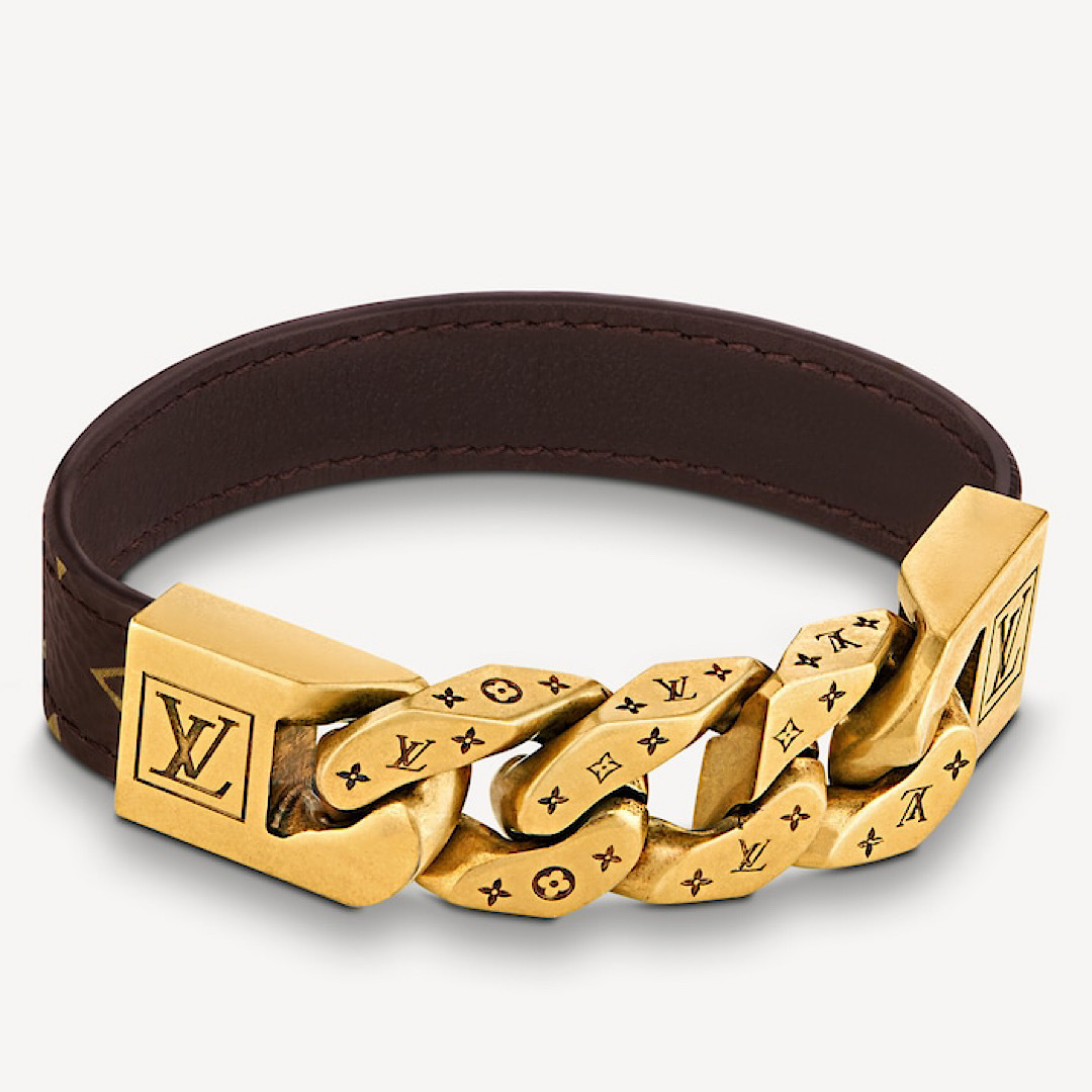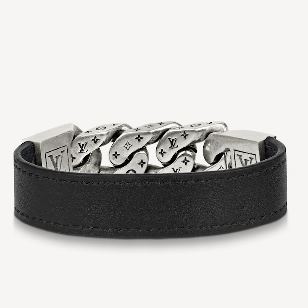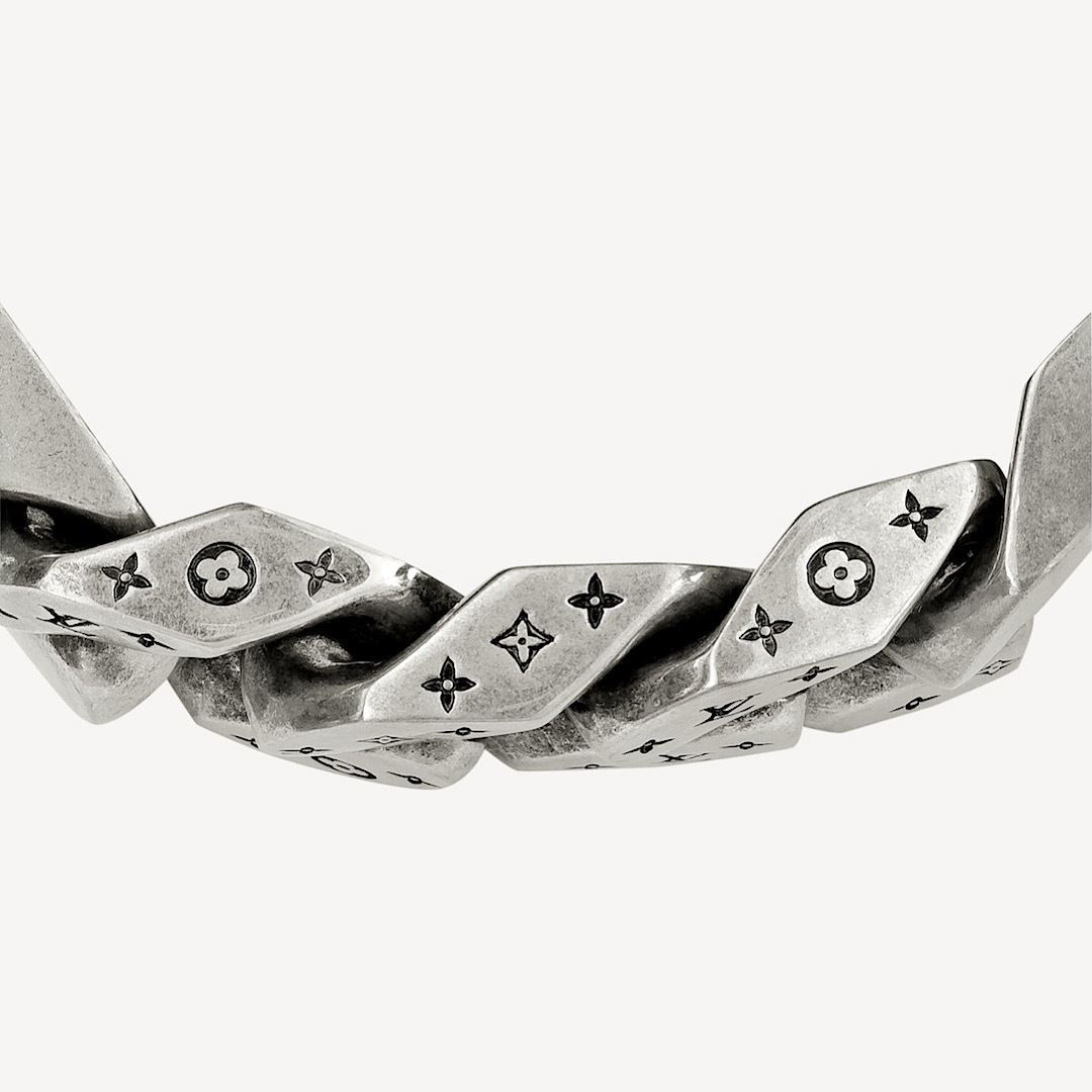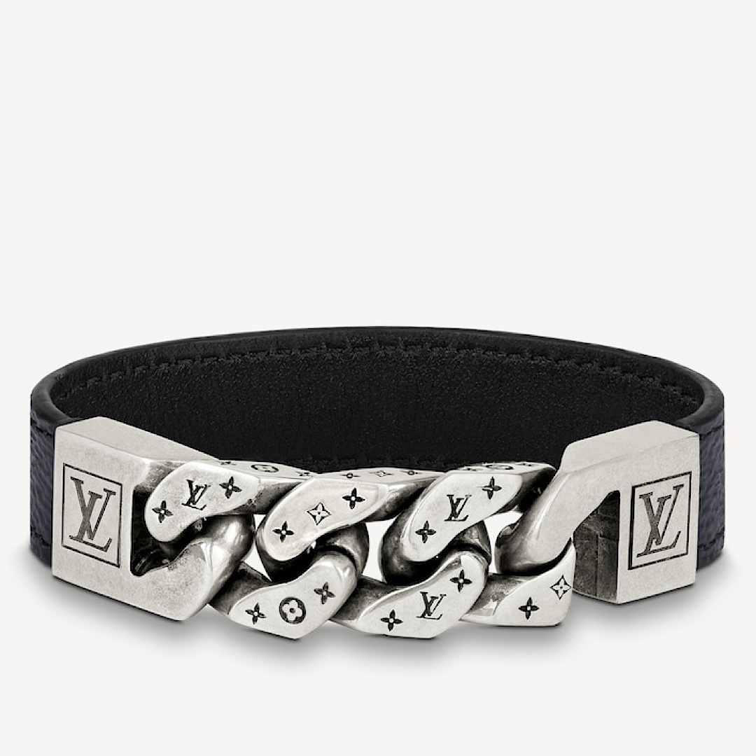 ヴァージル・アブローならではのファッションジュエリーデザインに、大胆なリバーシブルスタイルで遊び心を加えたブレスレット「ブラスレ・モノチェーン」。片面にはクラシカルなモノグラム・エクリプス キャンバスを、もう片面にはなめらかなブラックカーフレザーを使用しました。チャンキーなシルバーカラーのリンクにモノグラム・パターンとLV イニシャルを刻印して仕上げた、大胆でマスキュリンなアイテムです。