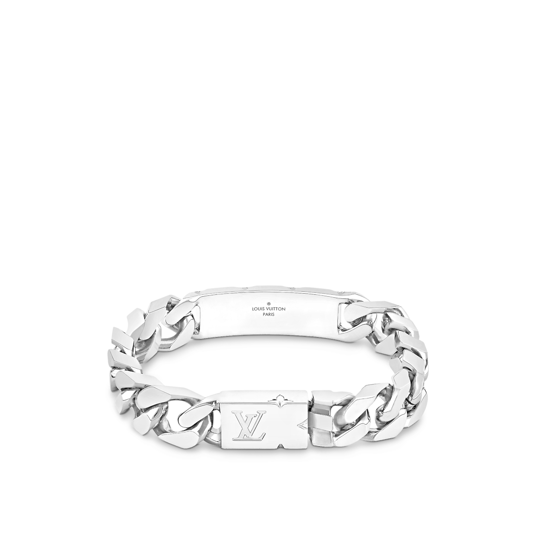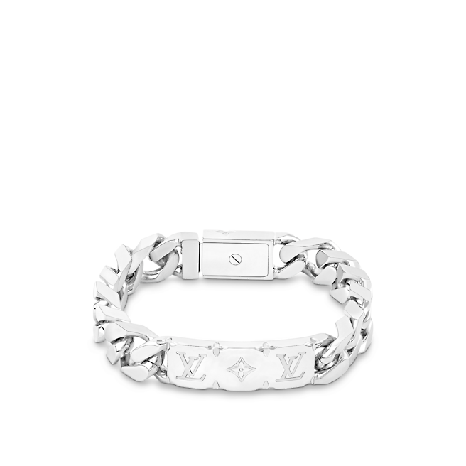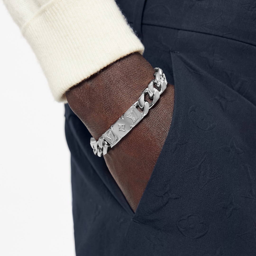 細かく彫刻されたモノグラム・パターンに光沢感のあるシルバーカラーの仕上げを施した「チェーンブレスレット モノグラム」。力強いデザインでマスキュリンな装いを演出するチェーンブレスレットは、紳士の日常のワードローブに欠かせないアイテムです。