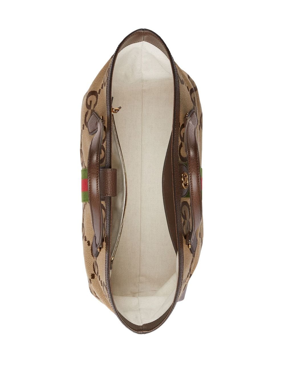 ベージュ、マルチカラー、レザー、キャンバス、ジャンボGGキャンバス、ウェブストライプ、ゴールドトーンのロゴプレート、ラウンドトップハンドル x 2、メインコンパートメント。