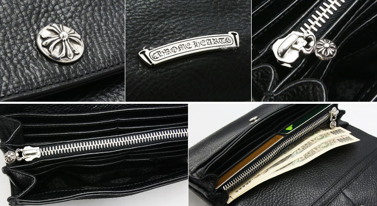 シンプルにクロムハーツの象徴でもある表側にクロスボタン、裏側にはスクロールラベル、二つのシルバーが、質感、シボ加工を際立たせているクロムハーツウォレット。