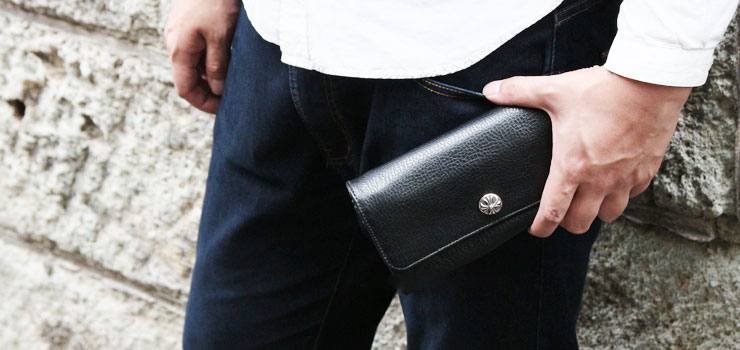 フロント中央のボタンで開閉するシングルボタンタイプの新しい長財布。クロムハーツの代表モチーフ、CHクロスを使ったシルバーボタンを使用しています。