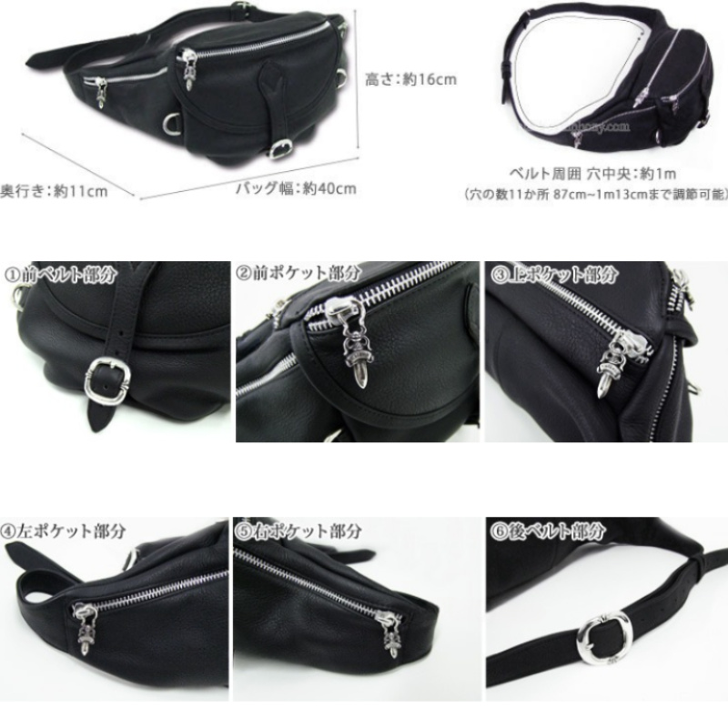 クロムハーツの革製品バッグには、「スナットパック#1 ラージ」が収納できるダガーモチーフが織り込まれた布袋がついています。