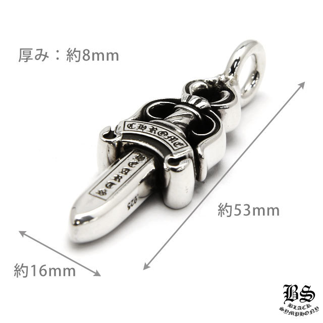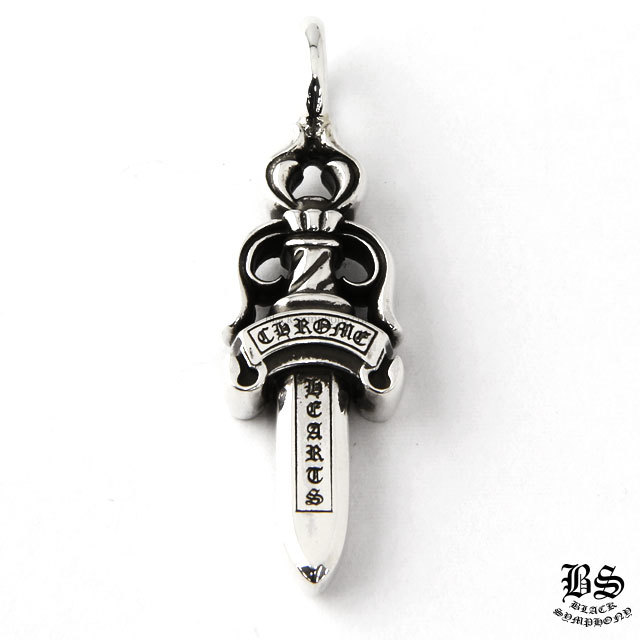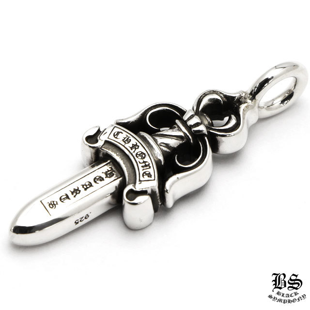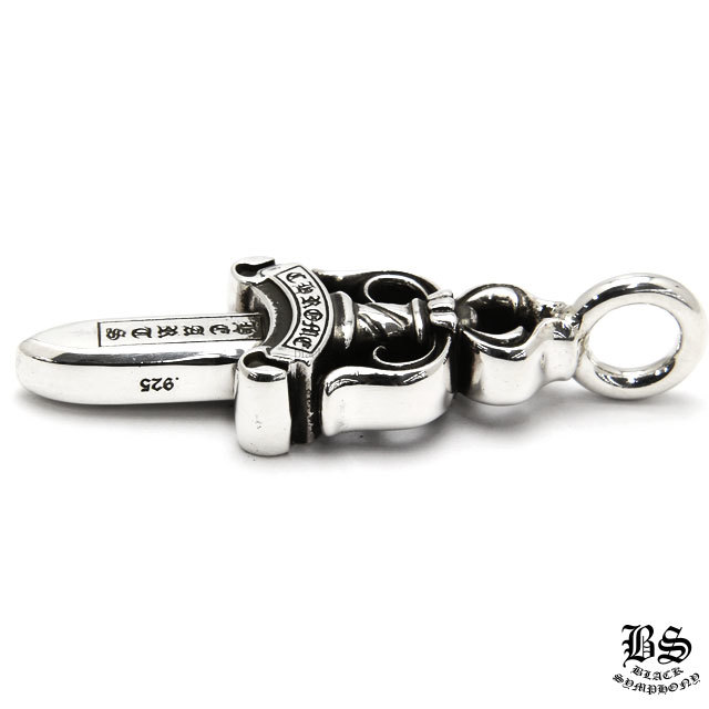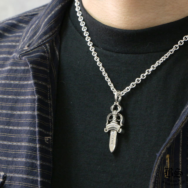 ペーパーチェーンネックレスや、NEチェーンネックレスを通して身に着けることを前提として作られたアイテムで、まるで本物のダガー(短剣)を思わせるような立体的フォルムが特徴。両面に彫り込まれた【CHROME HEARTS】の刻印でブランドアピールも表現されて、まさにクロムハーツらしいペンダントに仕上がっている。