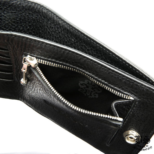 また、引き手部分にはシルバーの帝王クロムハーツらしく、細い銀のチェーンを編み込んだ繊細なデザインで、全体的に非常にデザイン性が高いレザーウォレットとなっています。