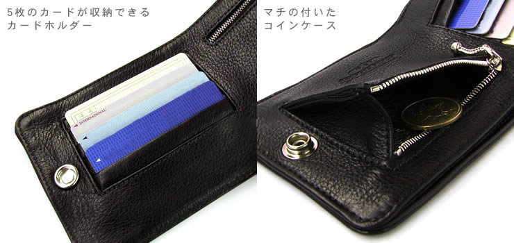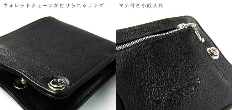 グロメットもついており、ウォレットチェーンを用いて使うことができる財布です。ビジネスシーンでは、そのまま持ち歩き、日常生活ではウォレットチェーンを通してオシャレにお使い頂くこともおすすめです。