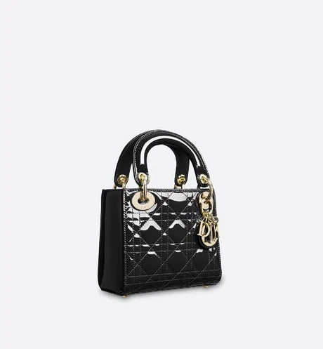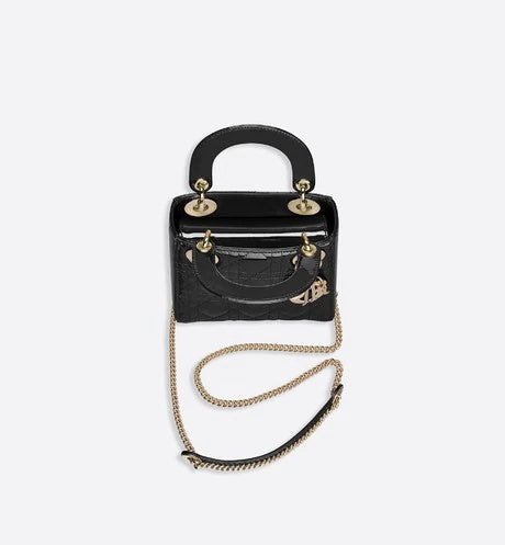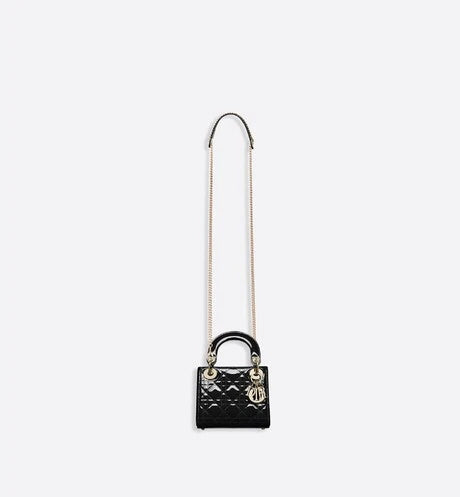 “カナージュ “ステッチがあしらわれたブラック エナメルカーフレザーの ” Lady (レディ ディオール)” チェーンミニバッグに、ペールゴールドメタルの アクセサリーが際立ちます。