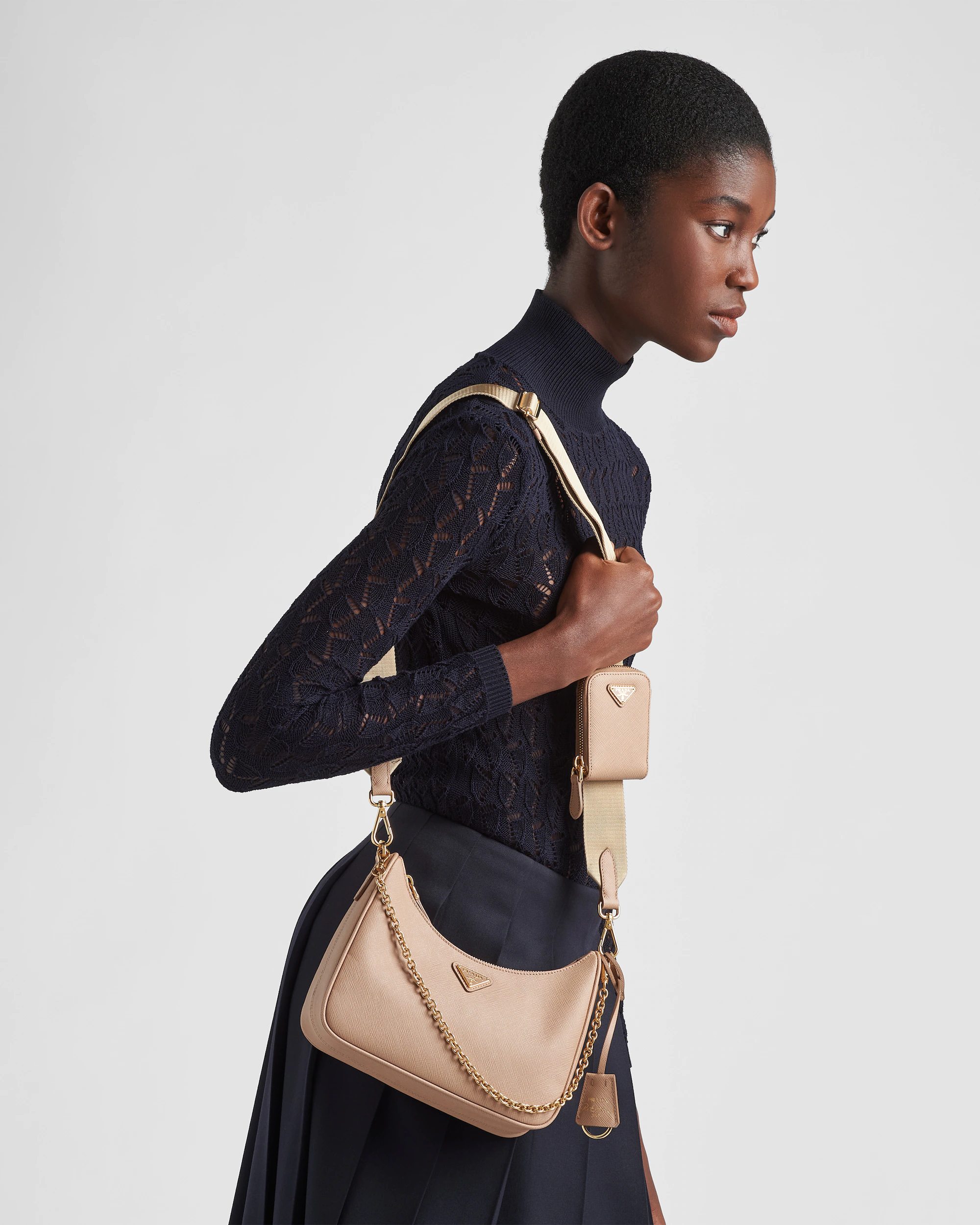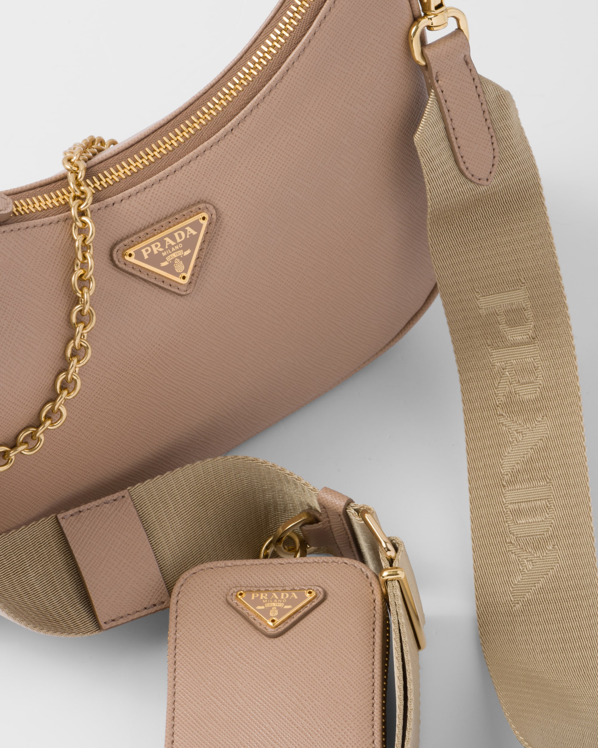 シンプルでスタイリッシュなシルエットをプラダのアイコニックな「サフィアーノ」レザーとトライアングルロゴでさらに洗練されたエレガントな印象に仕上げたアイテム。ショルダーストラップに取り付けるレザーポーチとRe-Editionキーリング付きで、様々な場面でお楽しみいただけるアイテムです。
