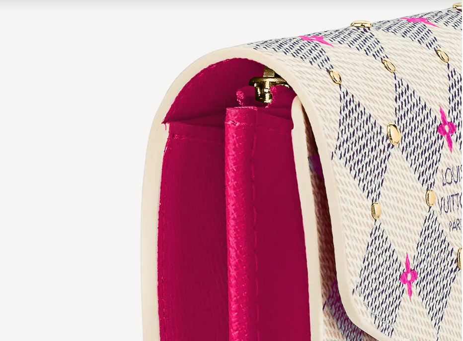 「ダミエ・アズール スタッズ」コレクションのスペシャルエディションのために再解釈された「ポルトフォイユ・サラ」。ダミエ・アズール キャンバスに、フューシャピンクのフラワー・モチーフのプリントと、繊細なゴールドカラーのスタッズをあしらいました。「Louis Vuitton」の刻印入りのスナップボタンで開閉するエンヴェロップ型の財布は、実用的で多機能な整理しやすい内装も魅力です。