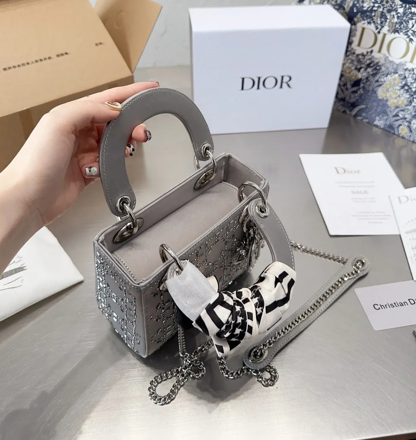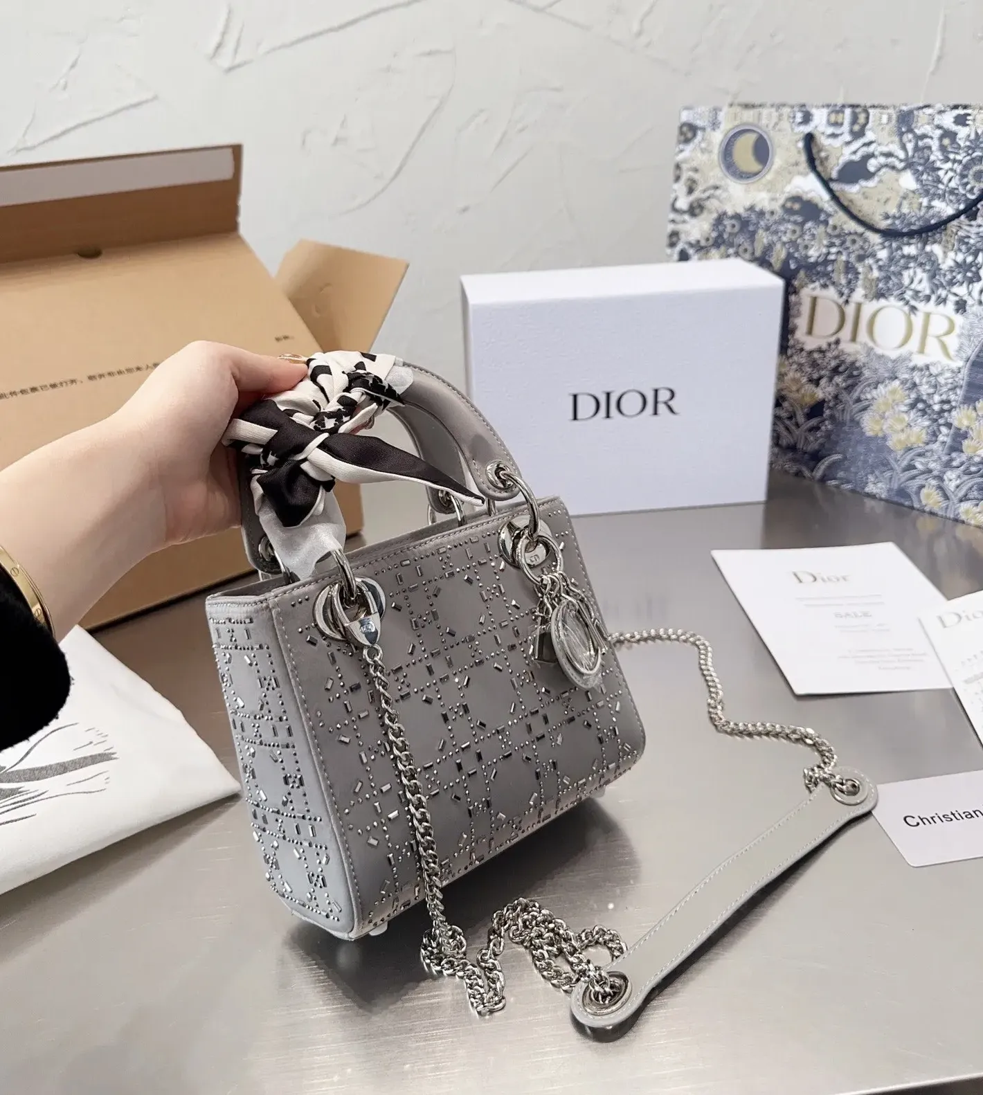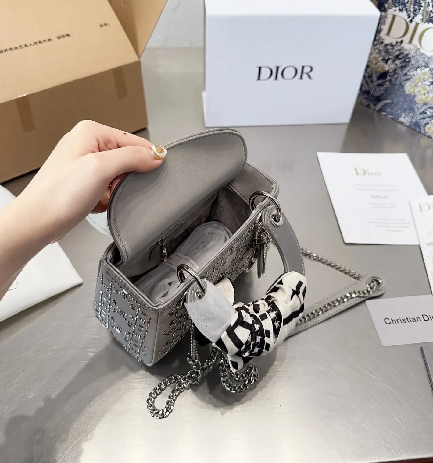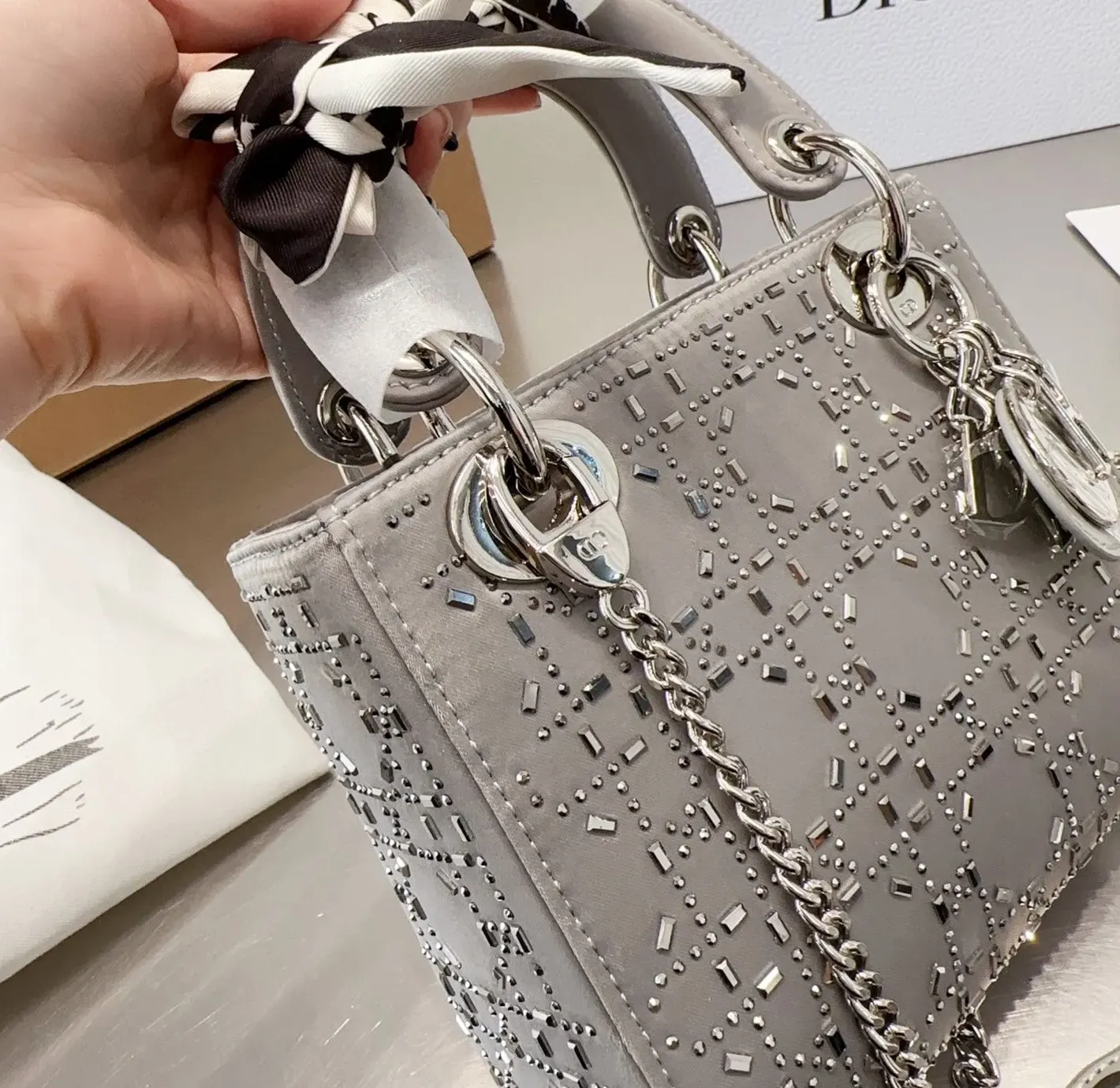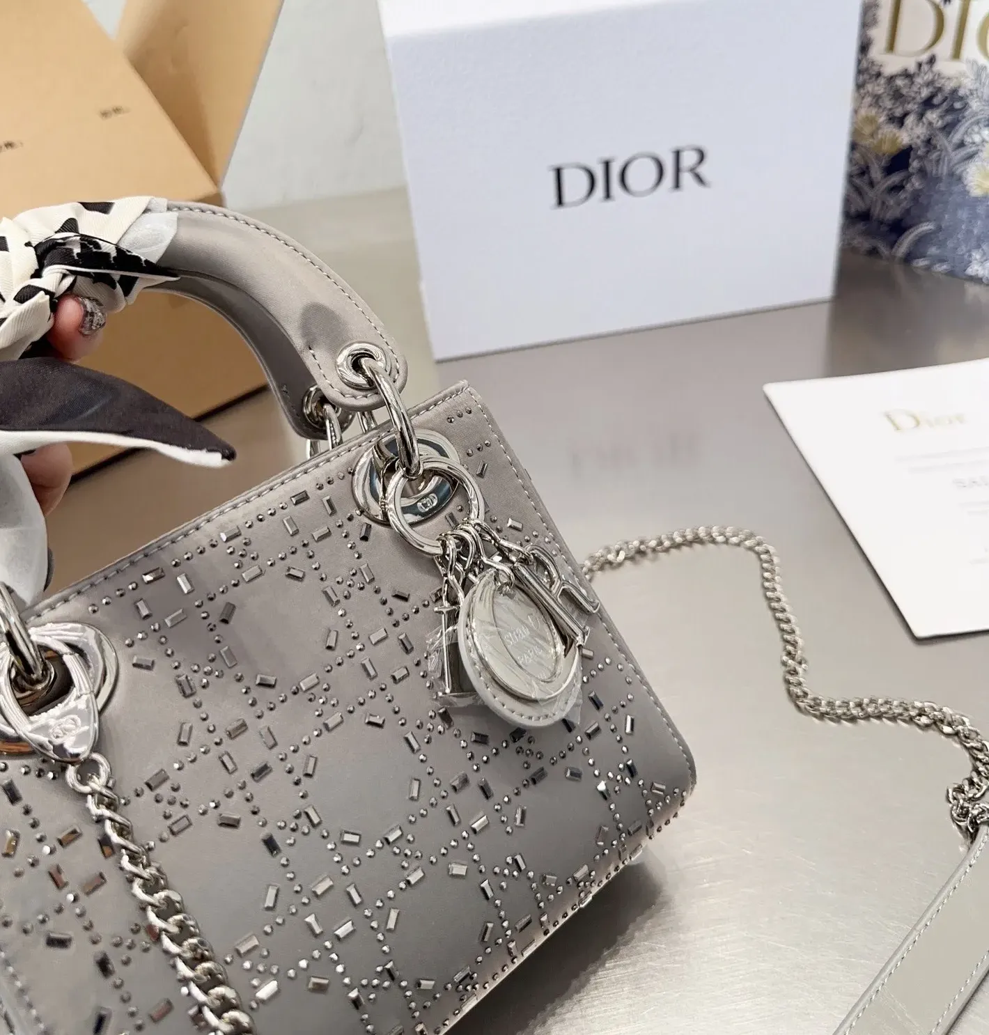 「大人気の「LADY DIOR」カナージュ サテン ミニバッグ」は Diorの典雅で美しい洞察力を集中的に表現したハンドバッグです。洗練されたエレガントな雰囲気とモダンなスタイルが融合された 永久的なクラシックアイテムです。グレーのサテン地には クリスタル模様があしらわれ イブニングガウンと