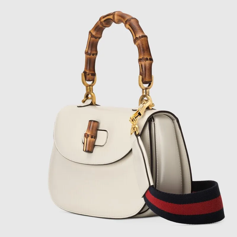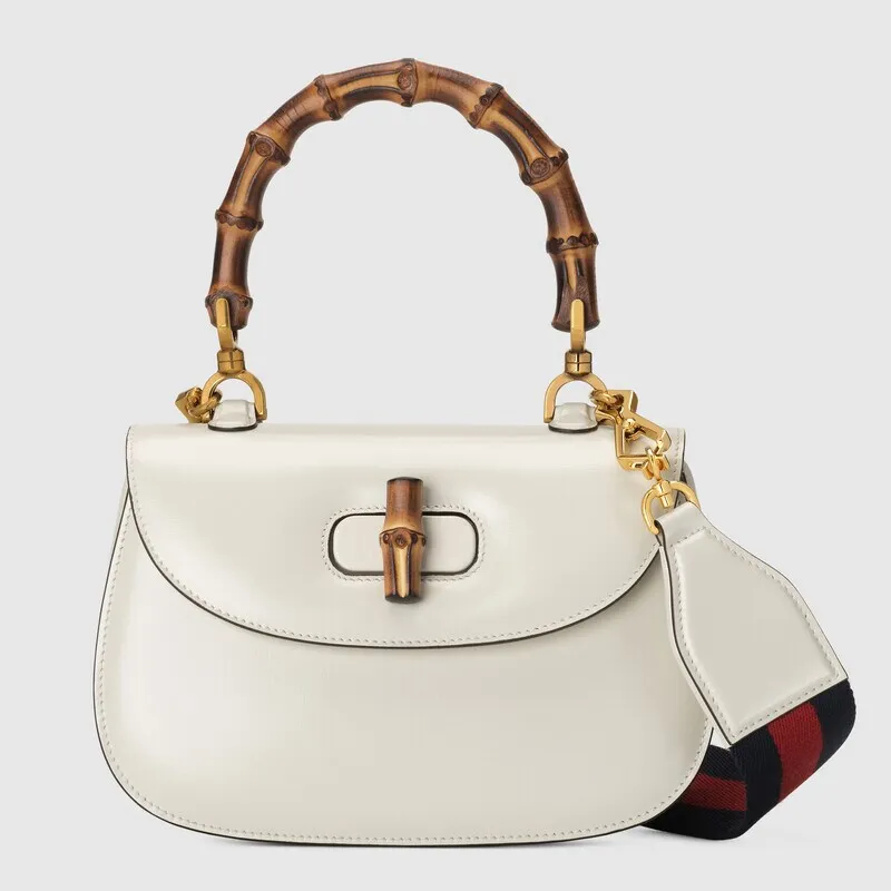 竹の結び目は グッチの永続的なデザイン遺産を象徴しています。 この鞄の竹の柄は炎の熱で曲がって形作られています。 この工芸品は 第二次世界大戦後のフィレンツェの職人から生まれました。 ハンドバッグは 取り外し可能なウェビングショルダーストラップ付きの白い革でできており 肩や手に持ち運べる用途の広い持ち運びオプションを作成します。 グッチの「アリア-ファッションアリア」シリーズは 時代を超えたクラシックなアイテムを解釈するためにさまざまな着用方法を使用して 実用的で用途の広いデザインに焦点を当てています。