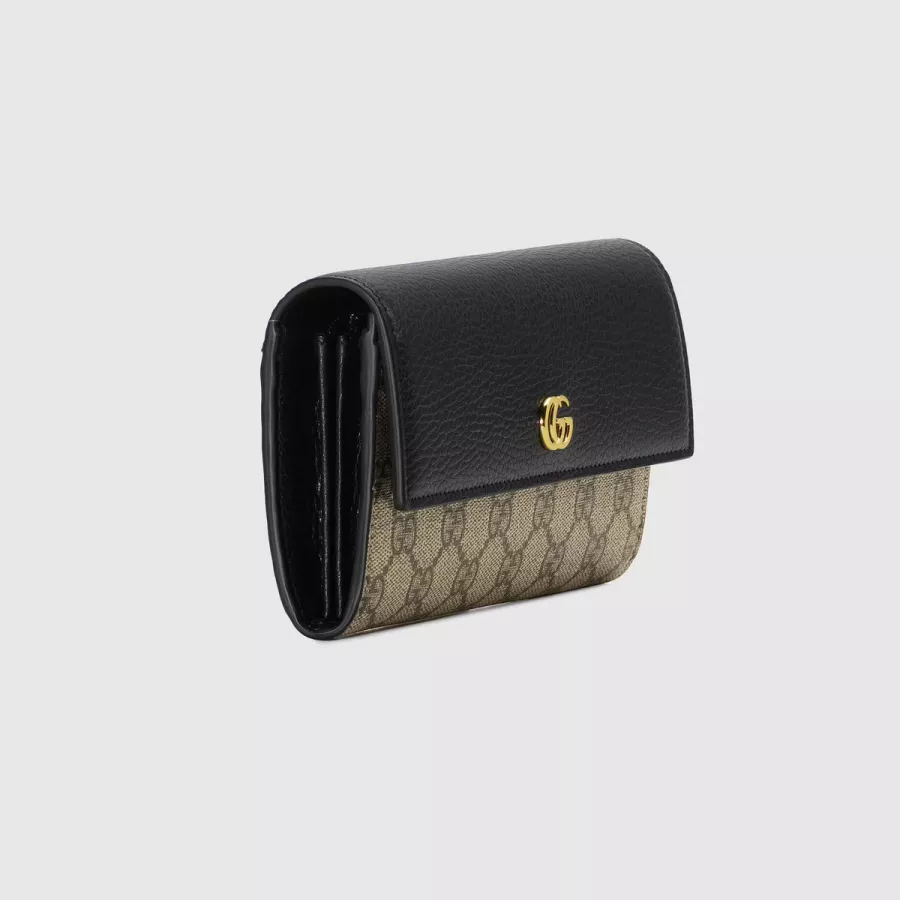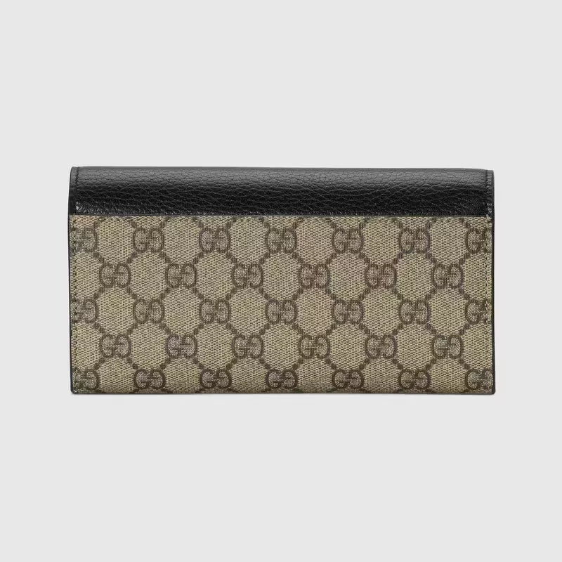 GGスプリーム キャンバスとホワイト レザーを組み合わせ グッチを象徴するダブルGの小さなハードウェアをあしらったコンチネンタルウォレット。内側には複数のカードスロットと紙幣用コンパートメントを2つ備えており スナップ クロージャーで開閉するデザインです。