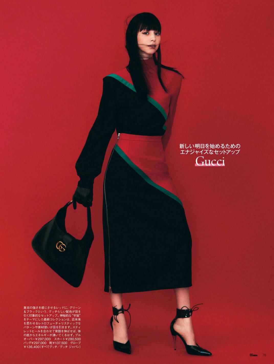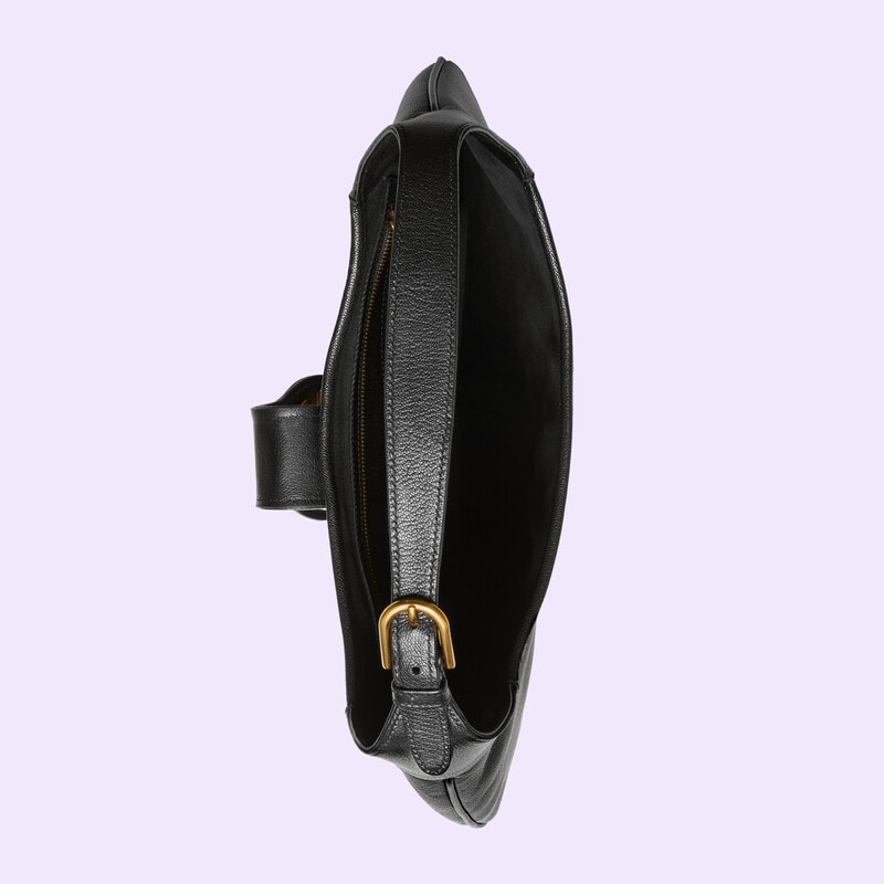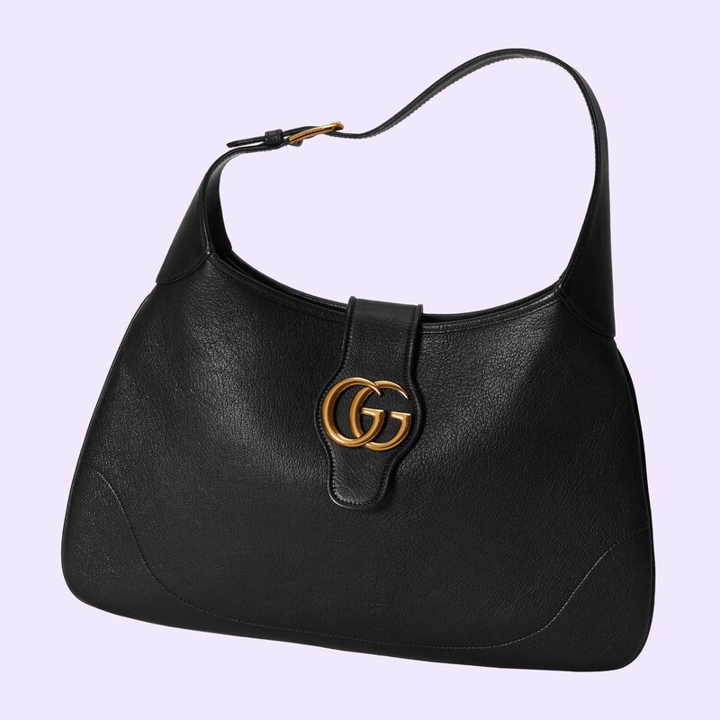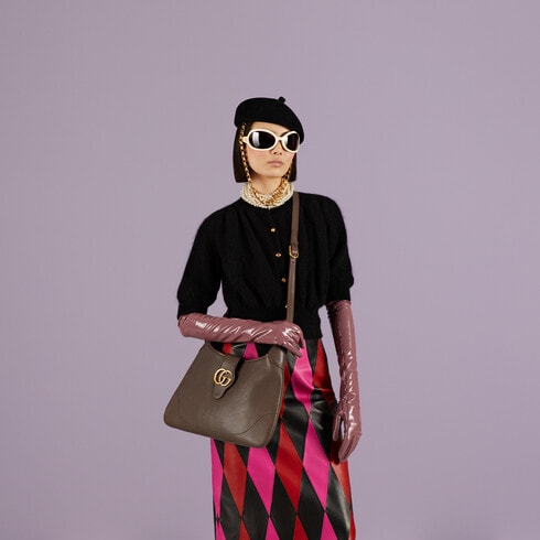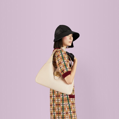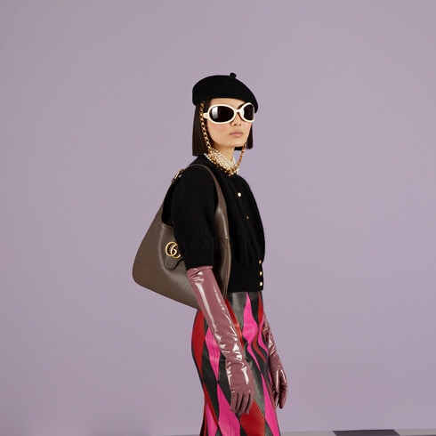 イタリアの古城カステル デル モンテを舞台に発表されたGucci Cosmogonie コレクション。遠く離れた時代や場所からの美学をひとつに引き合わせたこのショーでは、過去と現代のエレメント間につながりを結んでいます。ランウェイでも披露されたこの新しい三日月型ショルダーバッグは、グッチのアーカイブから着想を得たもので、ソフトレザーで仕立て、1970年代に誕生したダブルGのエンブレムをあしらいました。