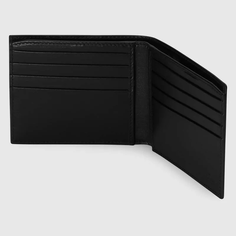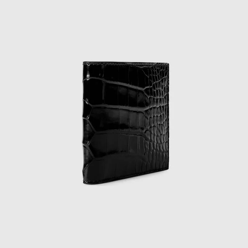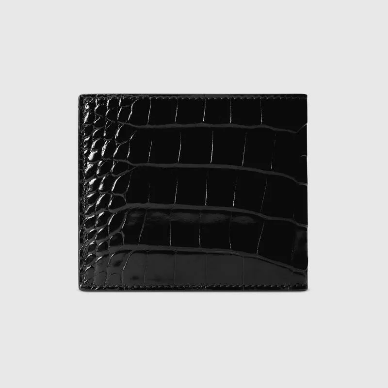 この二つ折り財布は 黒のクロコダイルレザーでできており 色調のレザーのディテールで装飾されており 光沢のある外観になっています。グッチのデザイン美学の観点から クラシックなベーシックスタイルを再解釈してください。