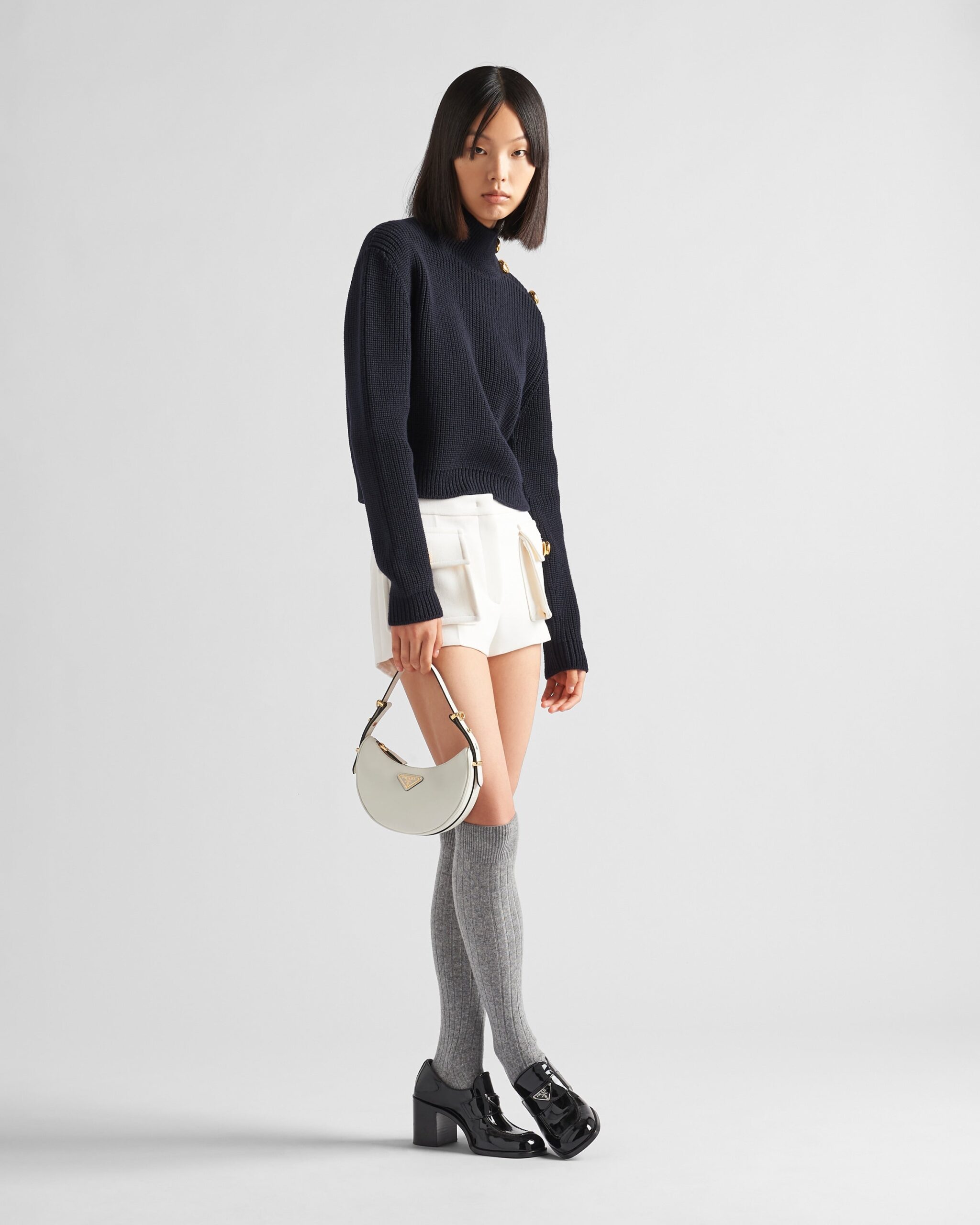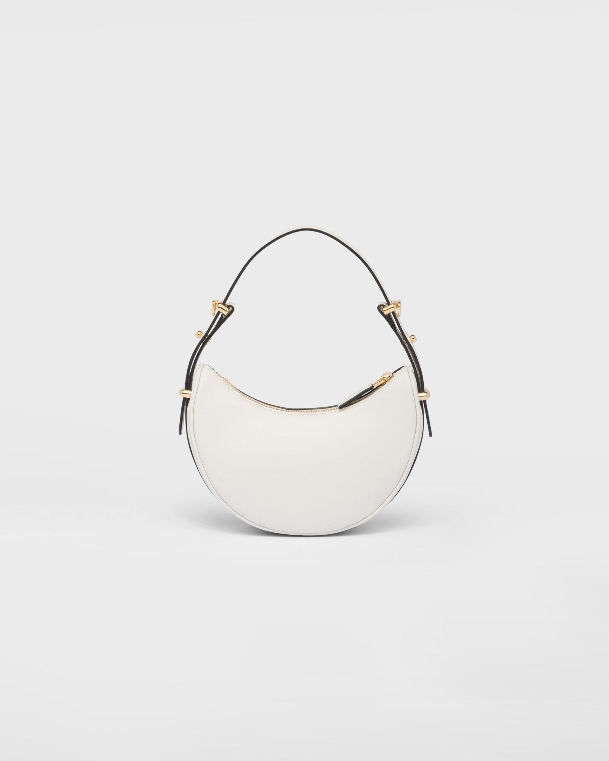 現代的な個性をたたえる、洗練された曲線的なシルエットのミニバッグ。レザーを使用し、使い勝手に優れたコンパクトなデザイン。エレガントなディテールと光沢のあるメタルパーツが華やかさをプラス。エナメルメタルのトライアングルロゴをあしらい、調節可能なエレガントなショルダーストラップで汎用性を高めています。
